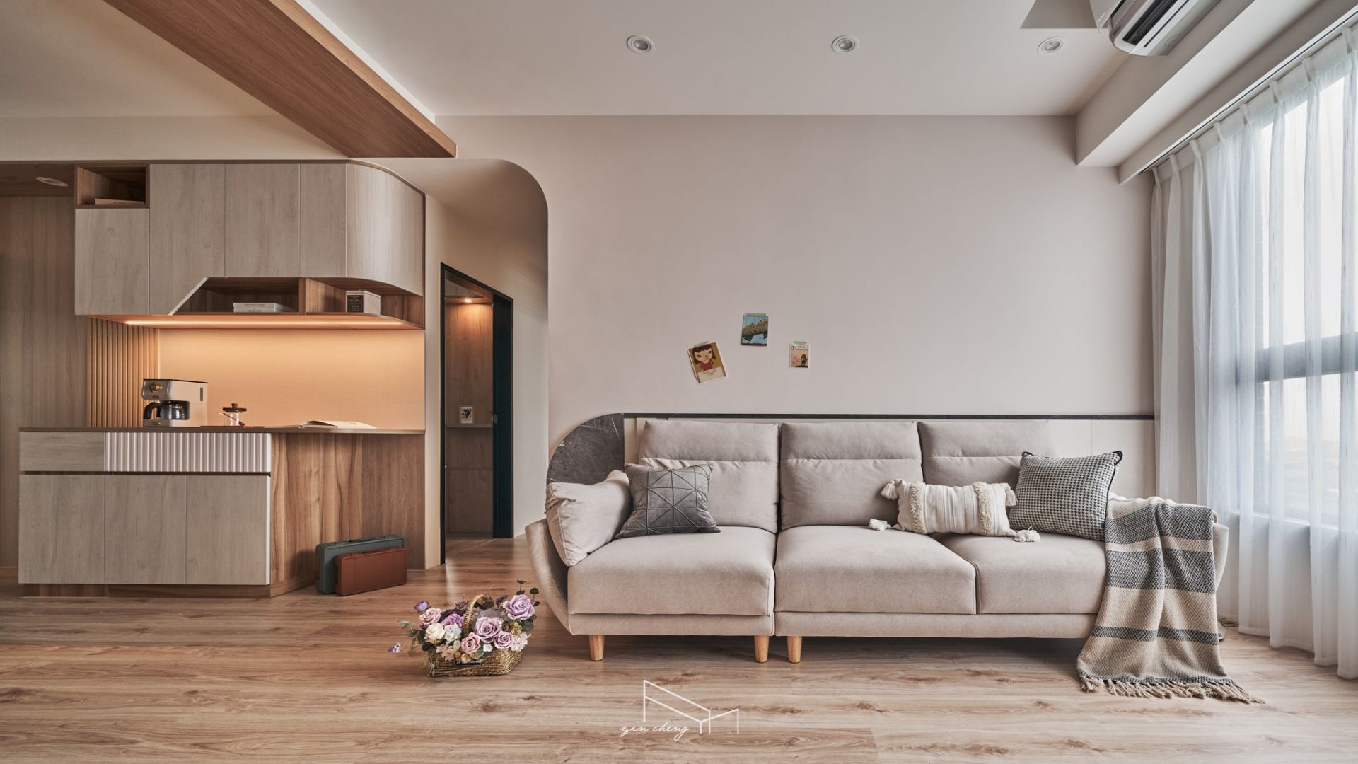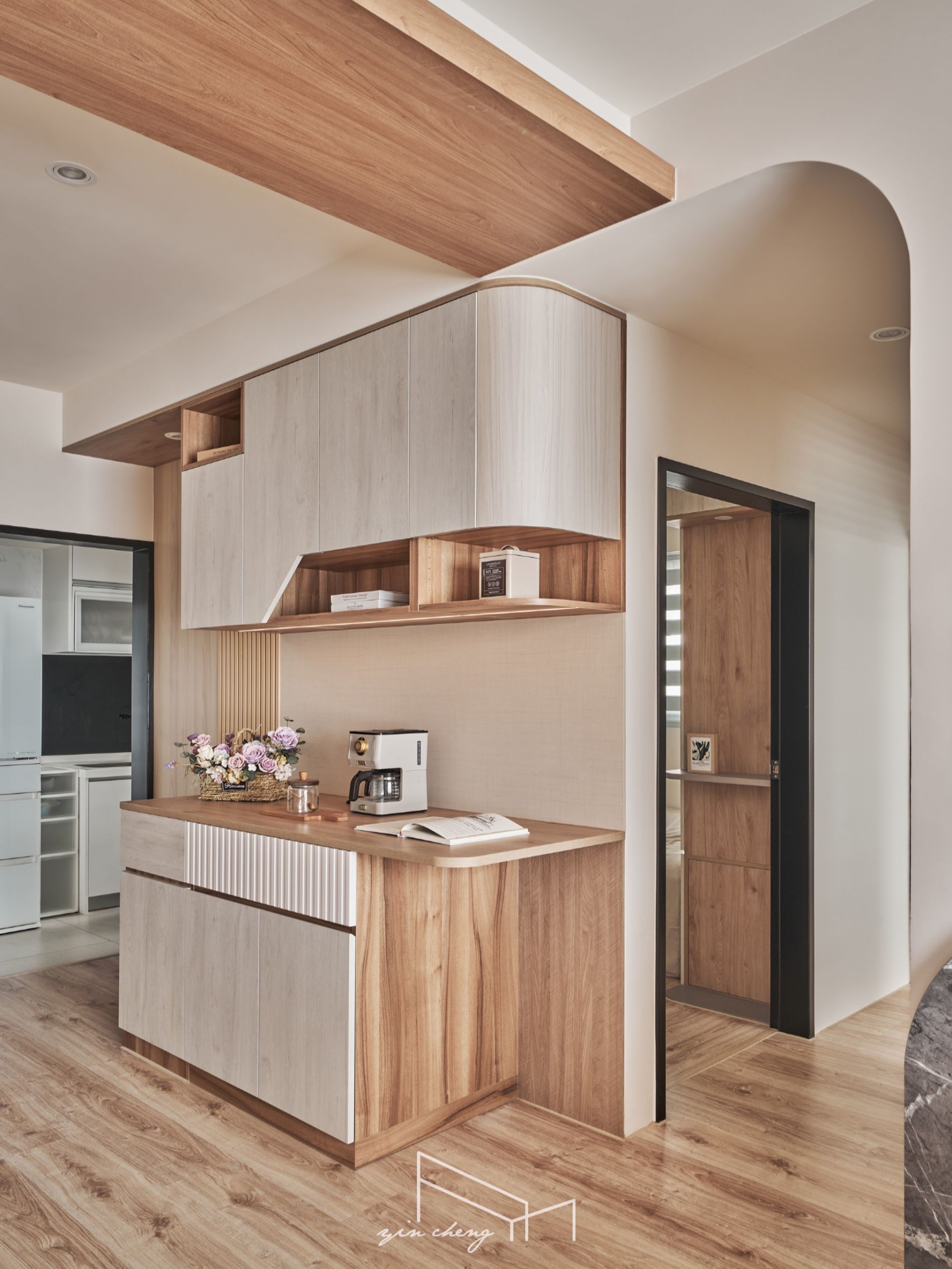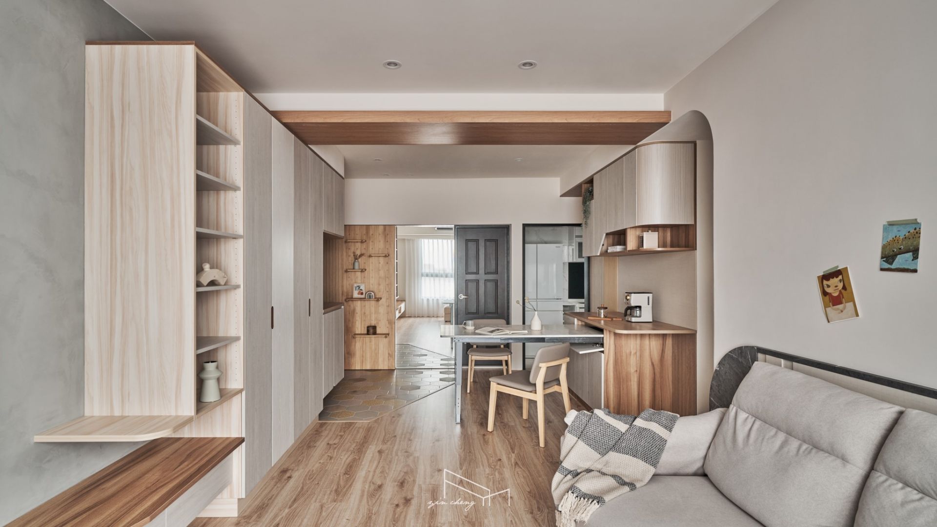 Warm wood tones anchor this compact residence. The bright and airy public areas evoke a sense of clarity and spaciousness. At the entryway, mirrored surfaces extend visual depth. The floral tiles define the foyer, introducing a sense of ceremony that elevates daily routines into something comforting and meaningful. The pegboard shoe cabinet blends storage and display functions to keep the transitional entryway orderly and composed. Geometric floor patterns paired with curved cabinets introduce visual tension and contrast, creating a striking first impression. Flowing curves naturally guide movement into the living area, where handcrafted gray plaster finishes lend the TV wall rustic charm. Its raw, grounded textures echo the soft, milky-gray tones of the backdrop wall, establishing a calm and welcoming atmosphere.
