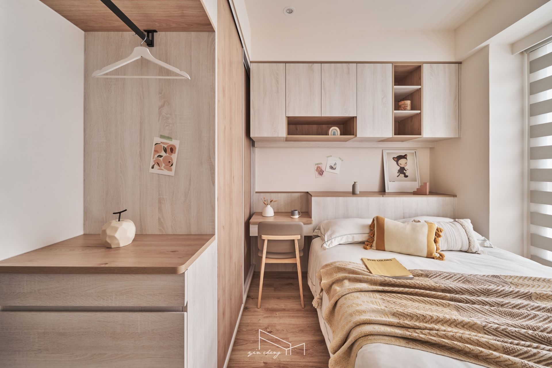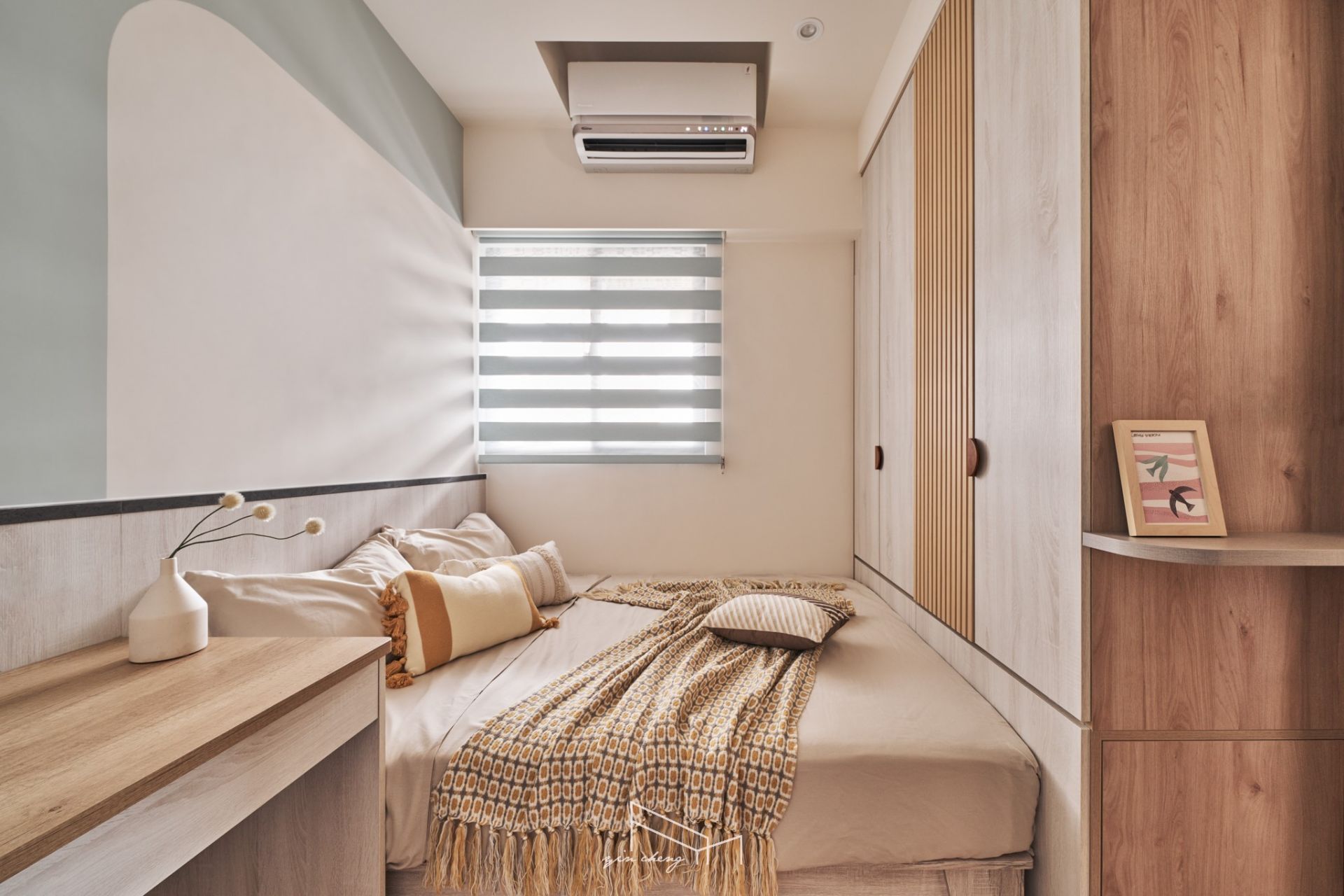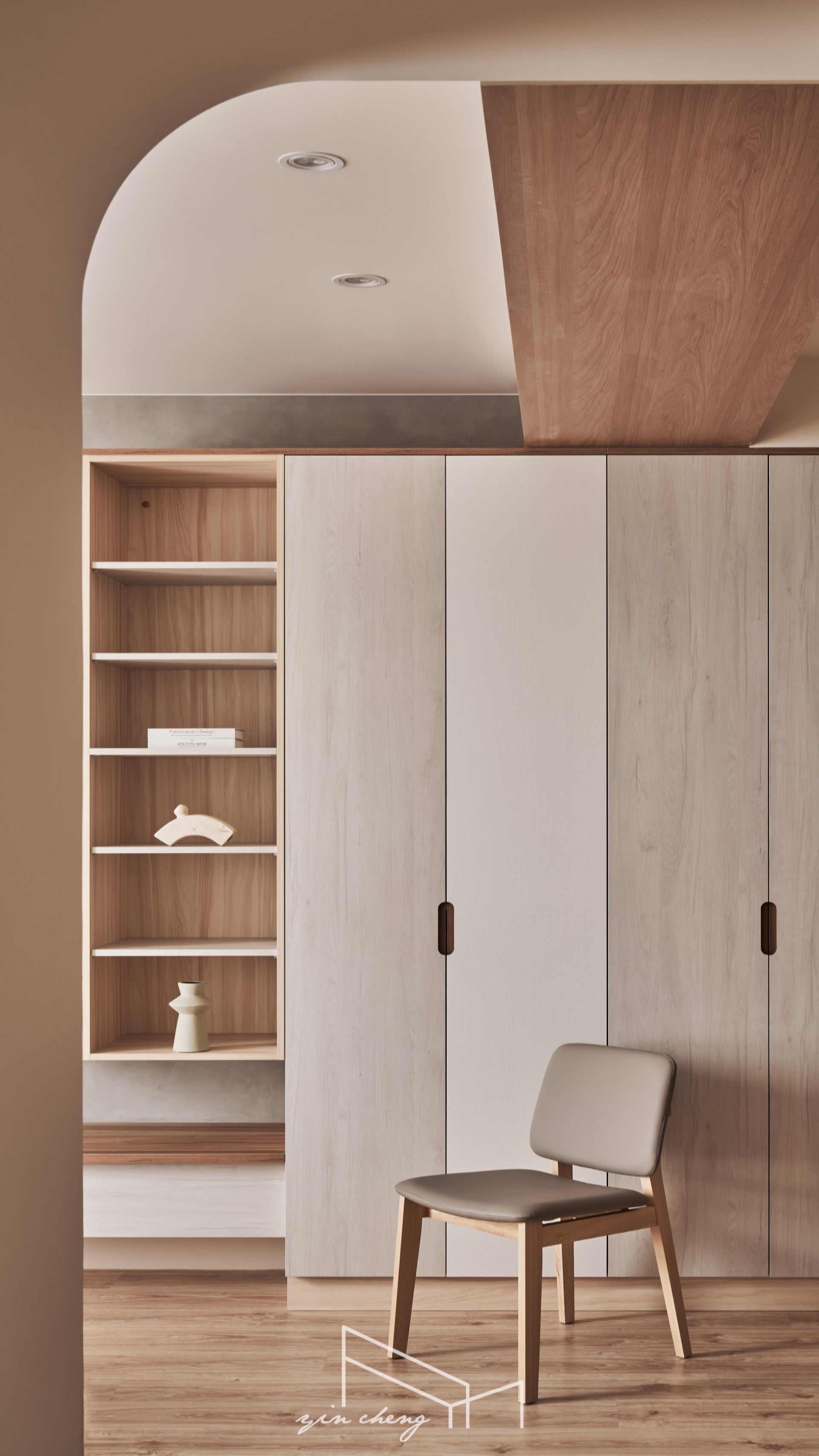 Warm wood tones anchor this compact residence. The bright and airy public areas evoke a sense of clarity and spaciousness. At the entryway, mirrored surfaces extend visual depth. The floral tiles define the foyer, introducing a sense of ceremony that elevates daily routines into something comforting and meaningful. The pegboard shoe cabinet blends storage and display functions to keep the transitional entryway orderly and composed. Geometric floor patterns paired with curved cabinets introduce visual tension and contrast, creating a striking first impression. Flowing curves naturally guide movement into the living area, where handcrafted gray plaster finishes lend the TV wall rustic charm. Its raw, grounded textures echo the soft, milky-gray tones of the backdrop wall, establishing a calm and welcoming atmosphere.