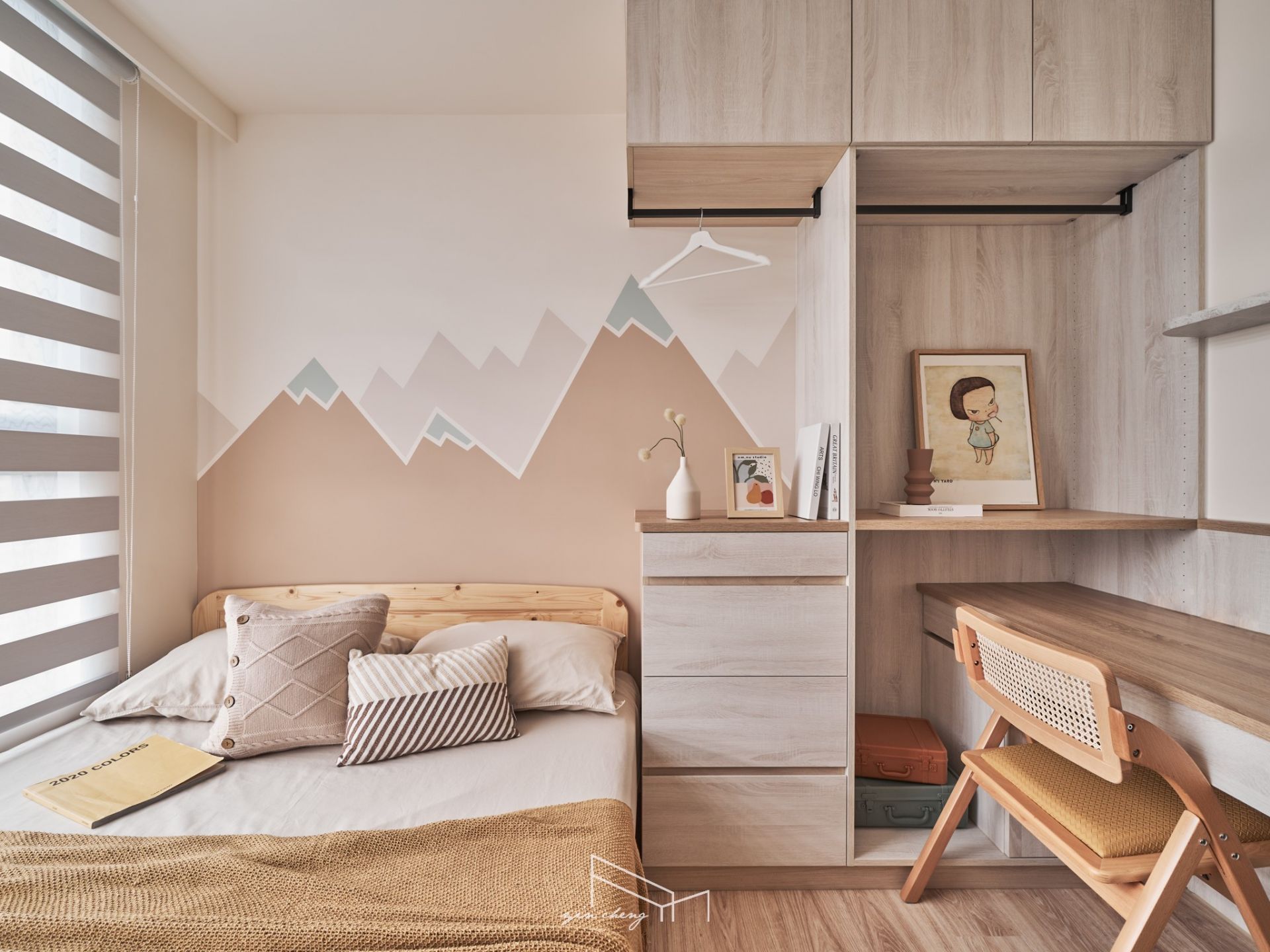 The dining area features a flexible folding table that fulfills everyday needs and ensures a smooth traffic flow, enhancing both comfort and spatial efficiency in the compact home. Above the corridor leading to the bedroom, curves soften the imposing presence of a low beam, transforming the otherwise rigid structure into a graceful design element that oozes warm and inviting atmosphere. The children's room is enlivened with playful mountain-shaped geometric patterns, adding a touch of whimsy. Thoughtful integration of functions maximizes the use of space, ensuring ample storage and comfort within limited square footage.
