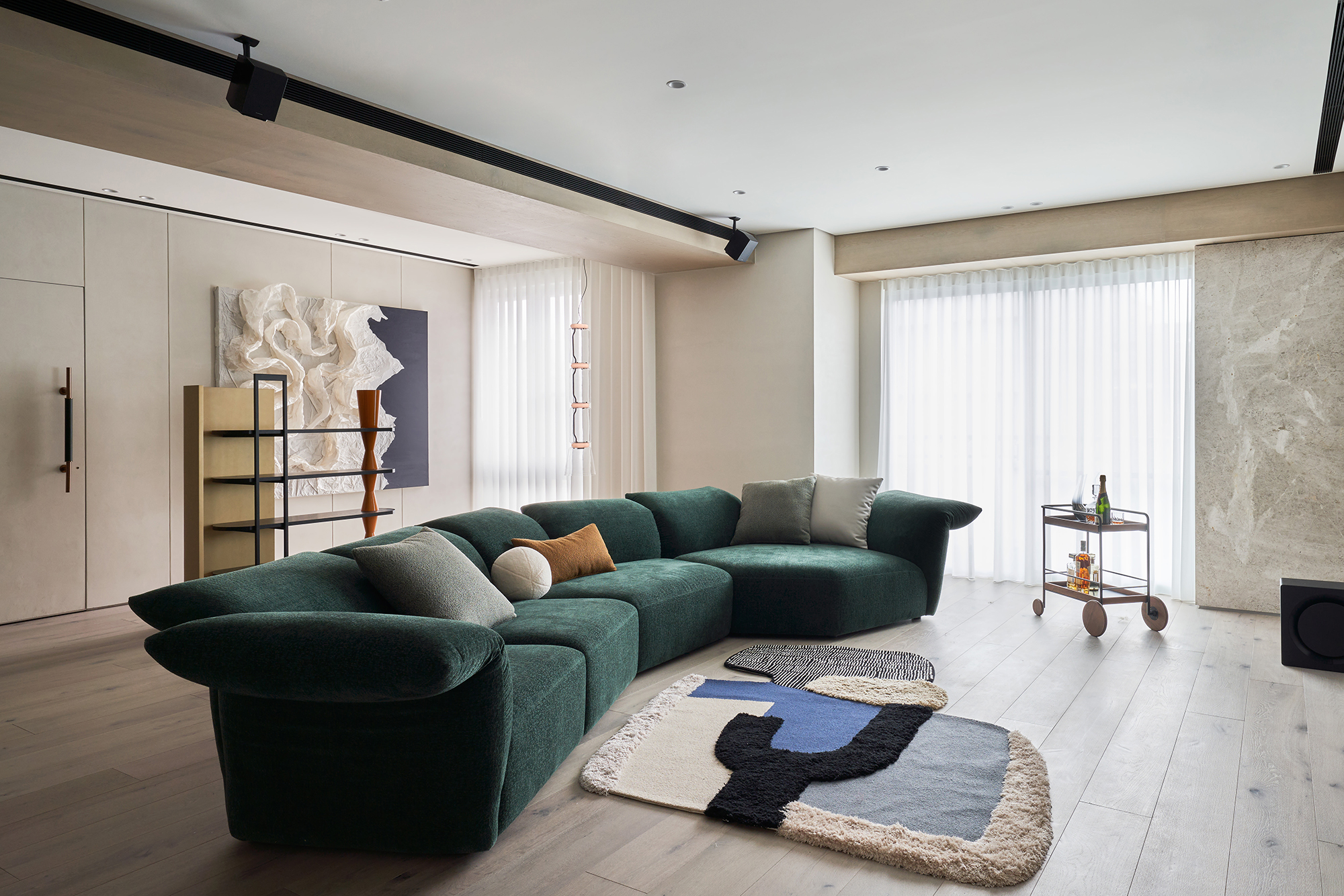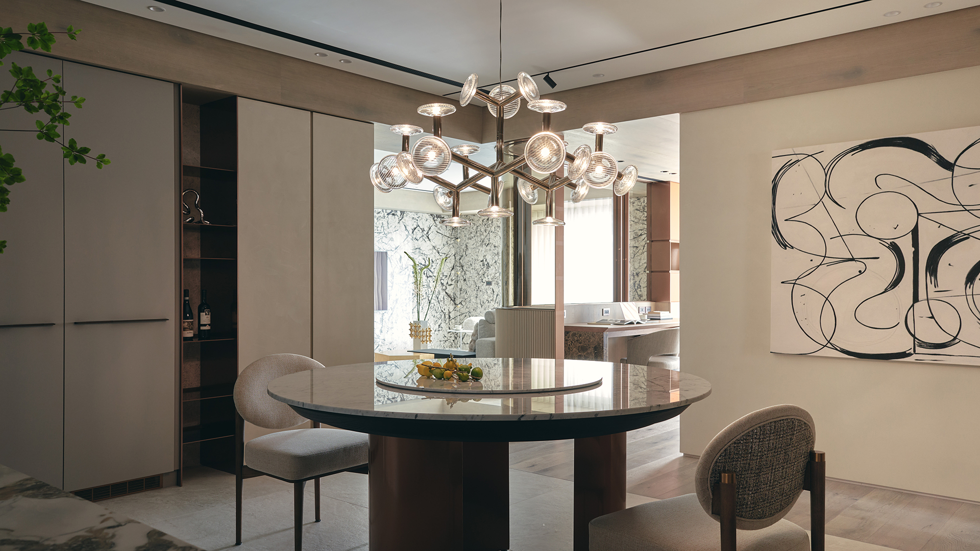 Moving into the study area, one will notice that the space features innovative curved glass panels and a semi-open partition design. This clever layout ensures privacy, while still allowing for a sense of openness and spatial continuity, making it an ideal retreat for focused work or quiet reading. In the dining area, a striking round table accommodates up to 12 guests, creating the perfect setting for memorable gatherings. Above, a stunning golden glass pendant light gracefully illuminates the space, infusing it with a modern and fashionable aesthetic. The cabinetry is meticulously designed to incorporate a wine rack, refrigerator, and various appliances, achieving a harmonious balance between visual cleanliness and practical storage functionality.
