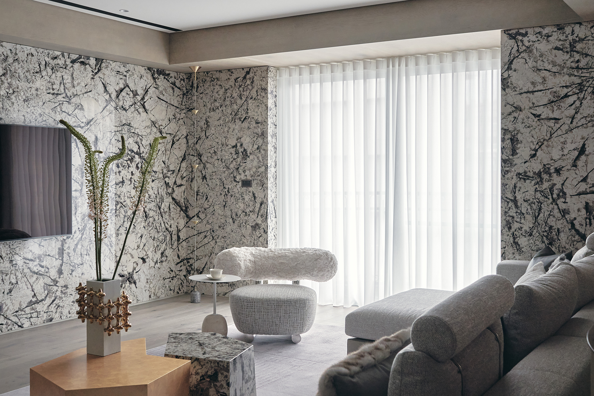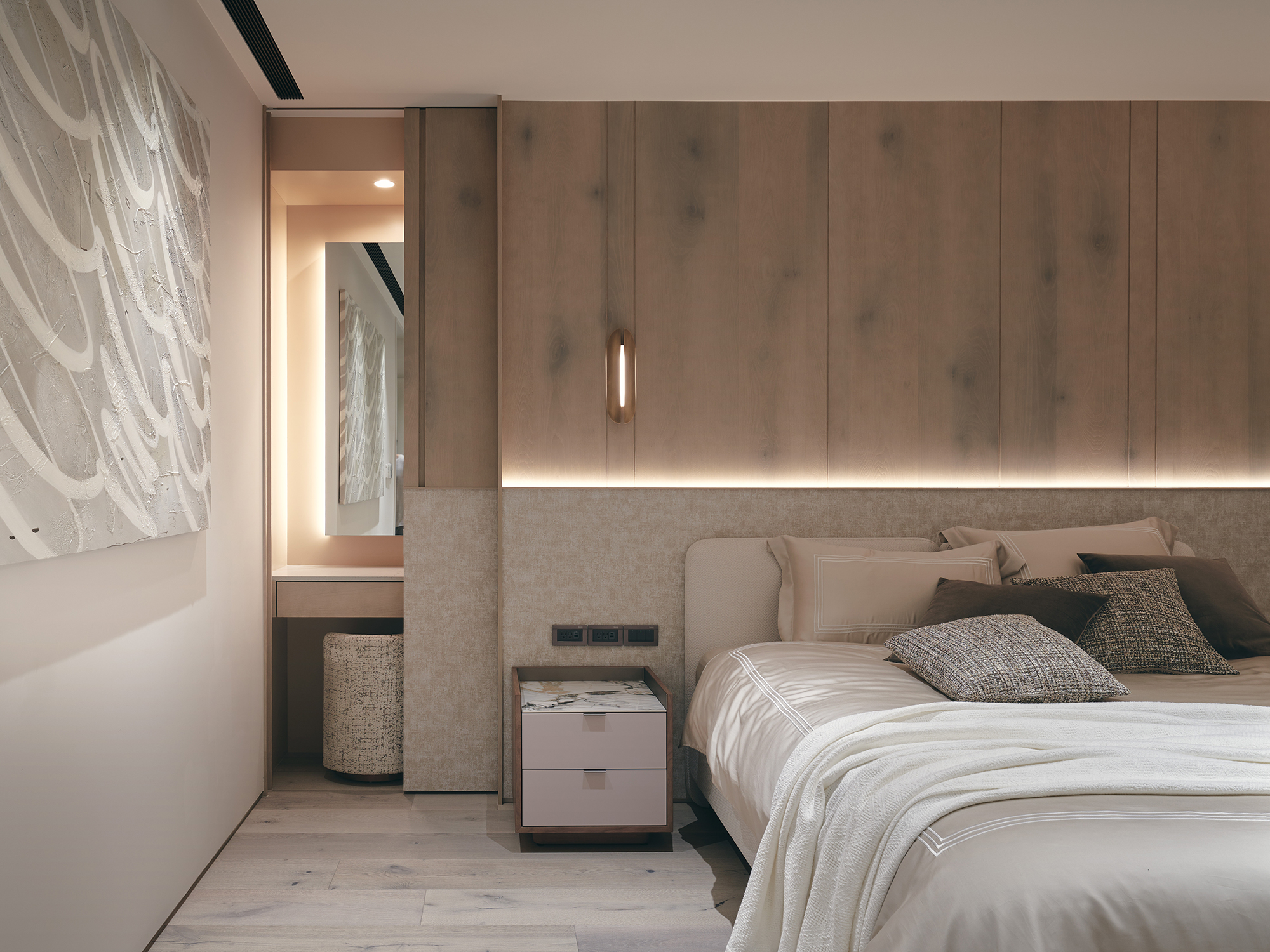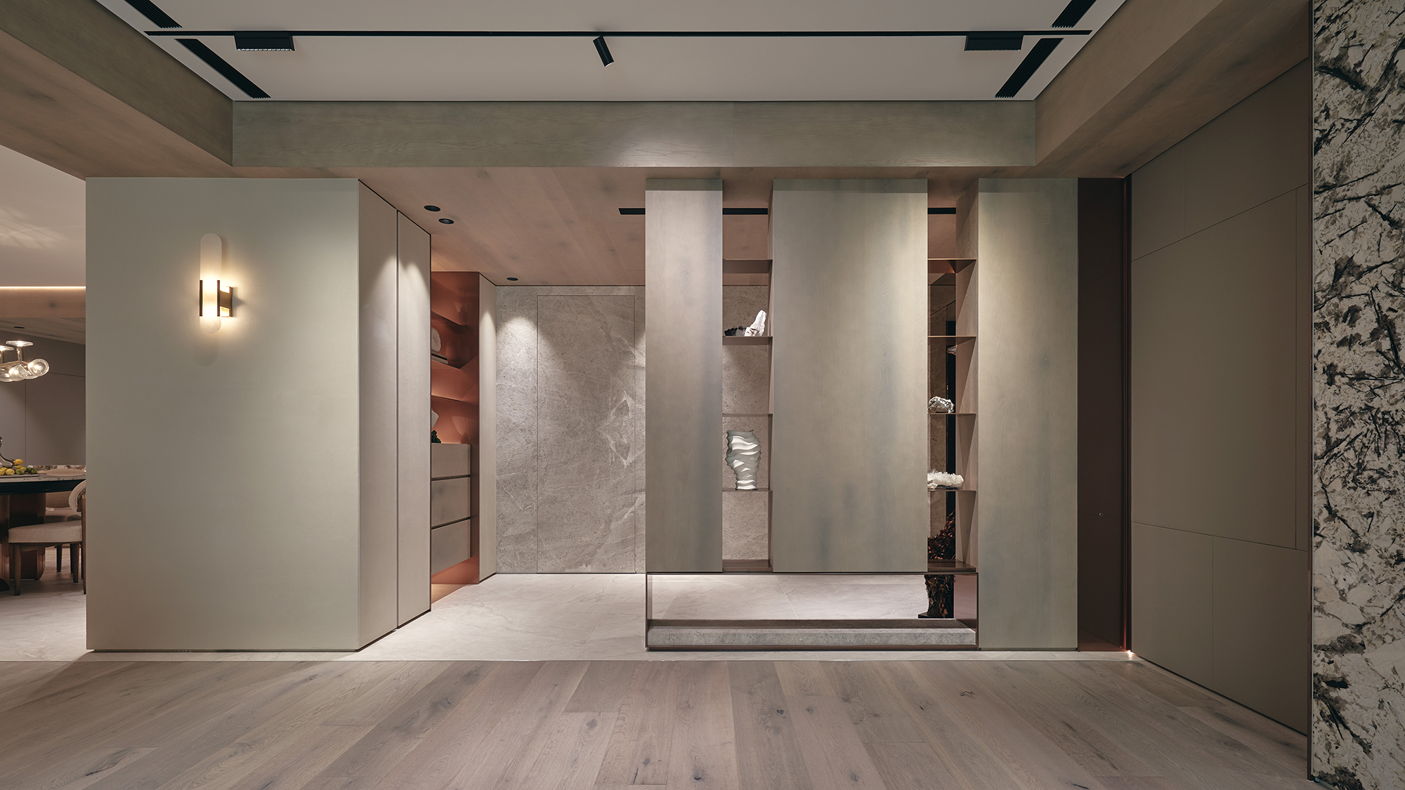 The interior design showcases an exquisite “through-wind” effect, featuring Angolan pearl stone as the primary wall material. This remarkable stone undergoes a special antique finish process, which beautifully accentuates its delicate natural patterns and substantial texture, creating a captivating visual experience. Transitioning into the heart of the home, one will notice that the living and dining areas exude modern luxury, enveloped in a harmonious palette of creamy white and soft beige tones. This color scheme not only enhances the elegance of the space but also fosters a serene and inviting atmosphere. The living room's main wall boasts luxurious stone with a jade-like texture, seamlessly paired with rich solid wood flooring and a wood-grain-patterned wood veneer ceiling. Furthermore, leather-upholstered cabinets introduce a refined touch, while the thoughtful combination of materials enriches the overall design, adding depth and character.