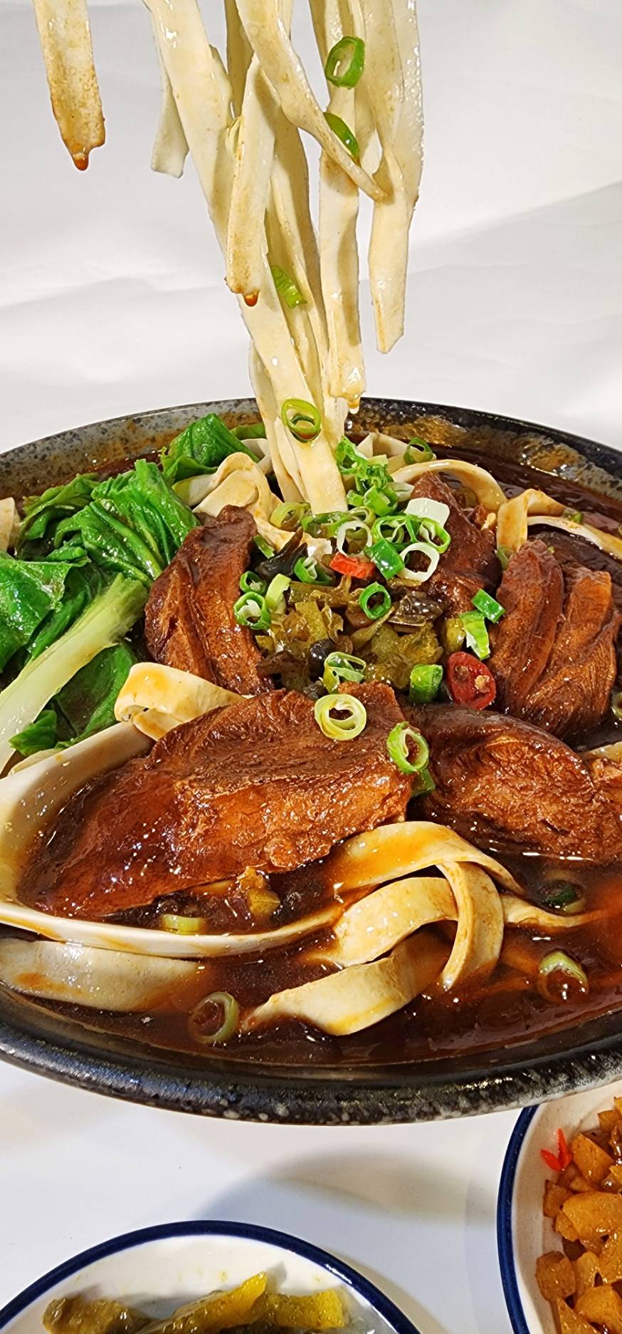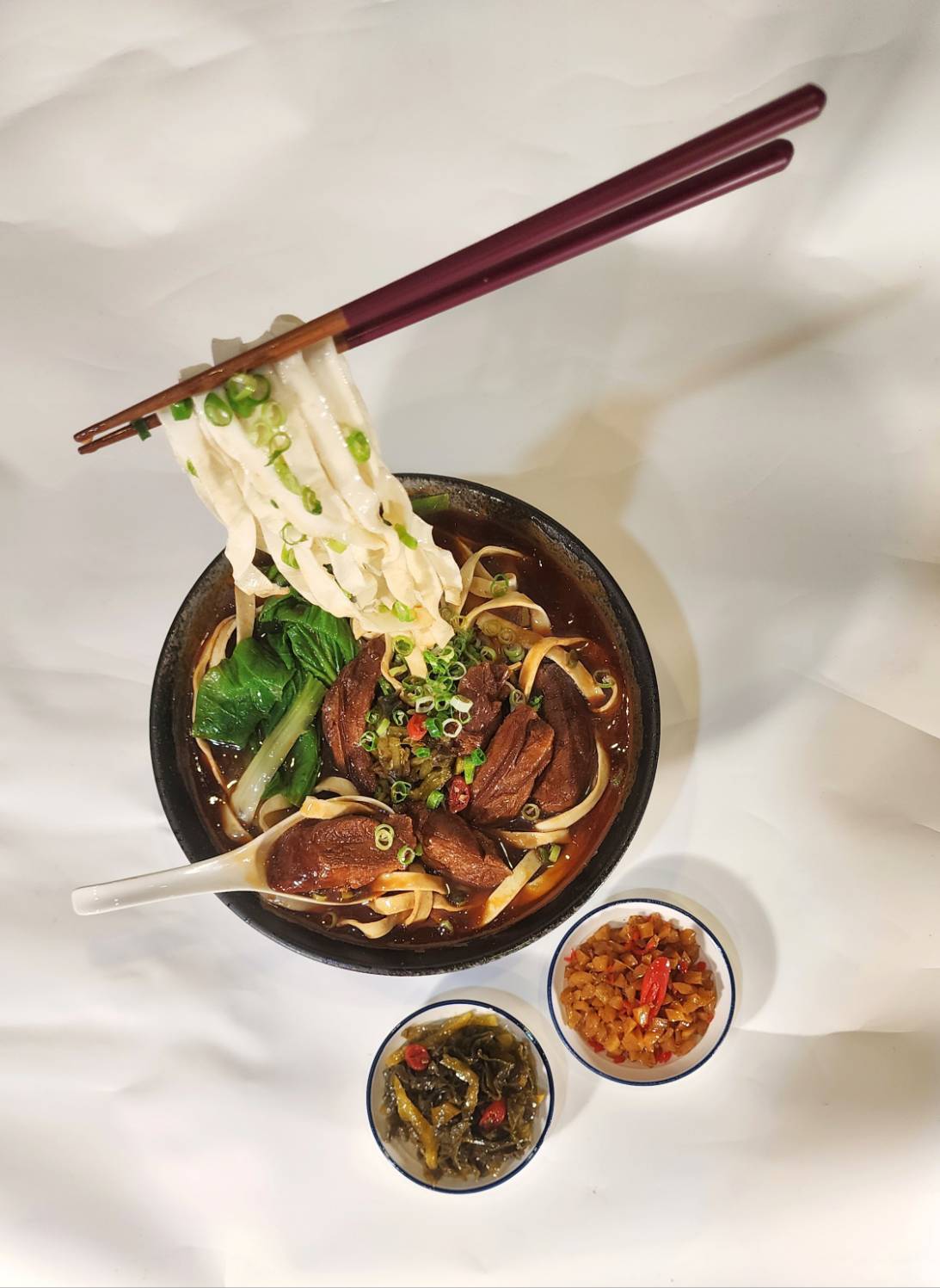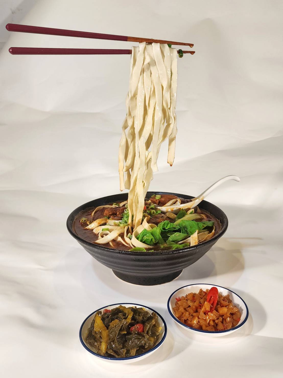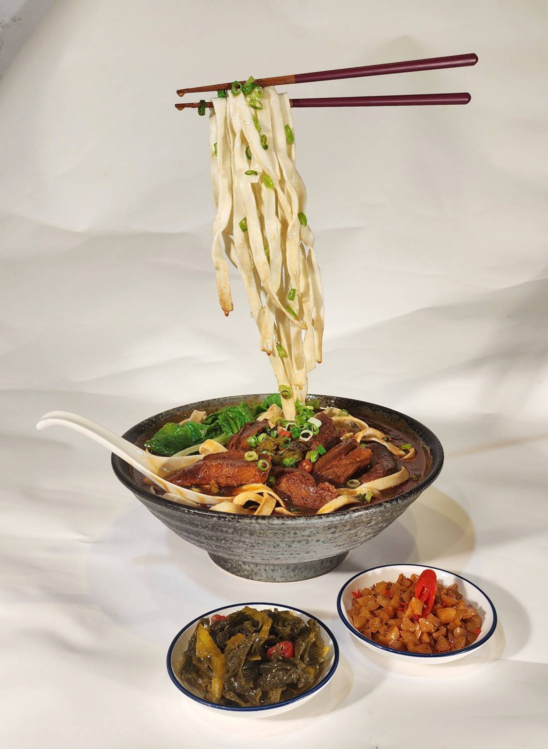 Suspended noodles defy gravity, freezing the moment of consumption and evoking the suspended state of human desire. Through meticulous hand-crafted elements such as the braised beef, noodles, broth, and side dishes, combined with an exaggerated floating presentation, the piece creates a surreal culinary scene beyond the dining table.