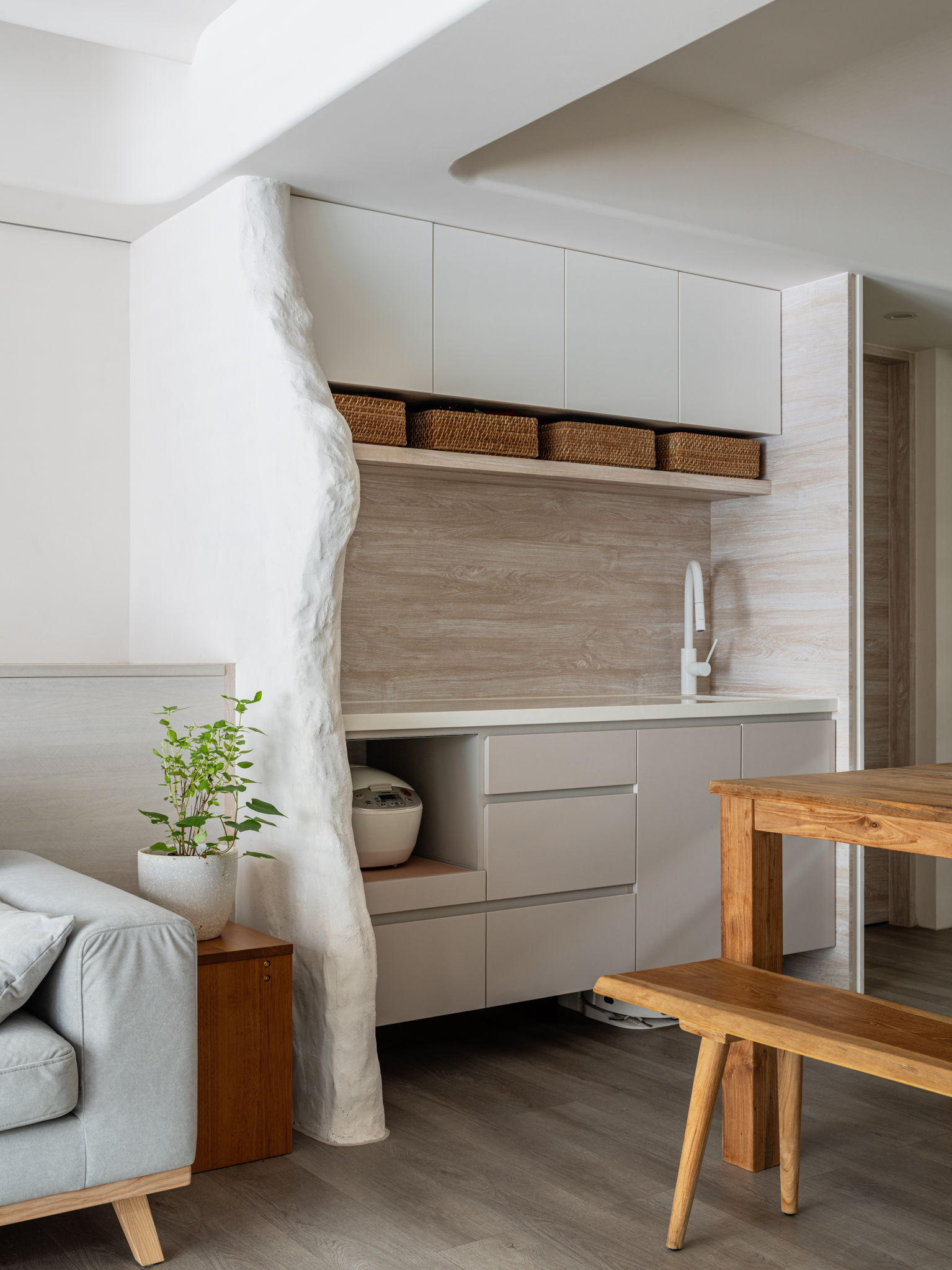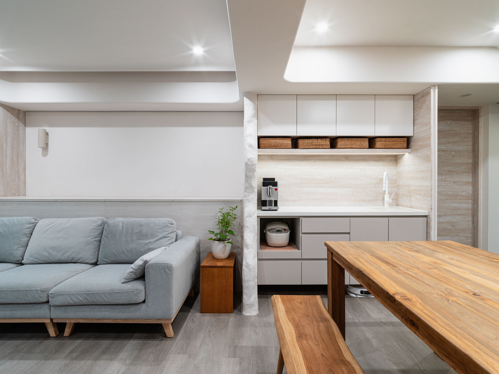 This renovation transforms a 50-year-old former Academia Sinica residence into a healthy, multi-generational home. Located in a quiet Taipei alley, it now houses four adults, two children, and two pets, embracing sustainable and inclusive living. The design prioritizes green renovation principles using non-toxic, low-VOC materials such as diatomaceous earth paint and breathable mineral coatings. Natural cross-ventilation, soft daylight, and spatial openness form the foundation of the intervention. The existing structure posed significant challenges: a low ceiling height of just 2.8 meters, outdated electrical and plumbing systems, and a fragmented floor plan. The design team addressed these by selectively removing partitions, and introducing rounded corners throughout to eliminate sharp transitions. The spatial language is soft yet grounded, merging wabi-sabi restraint with pragmatic living.