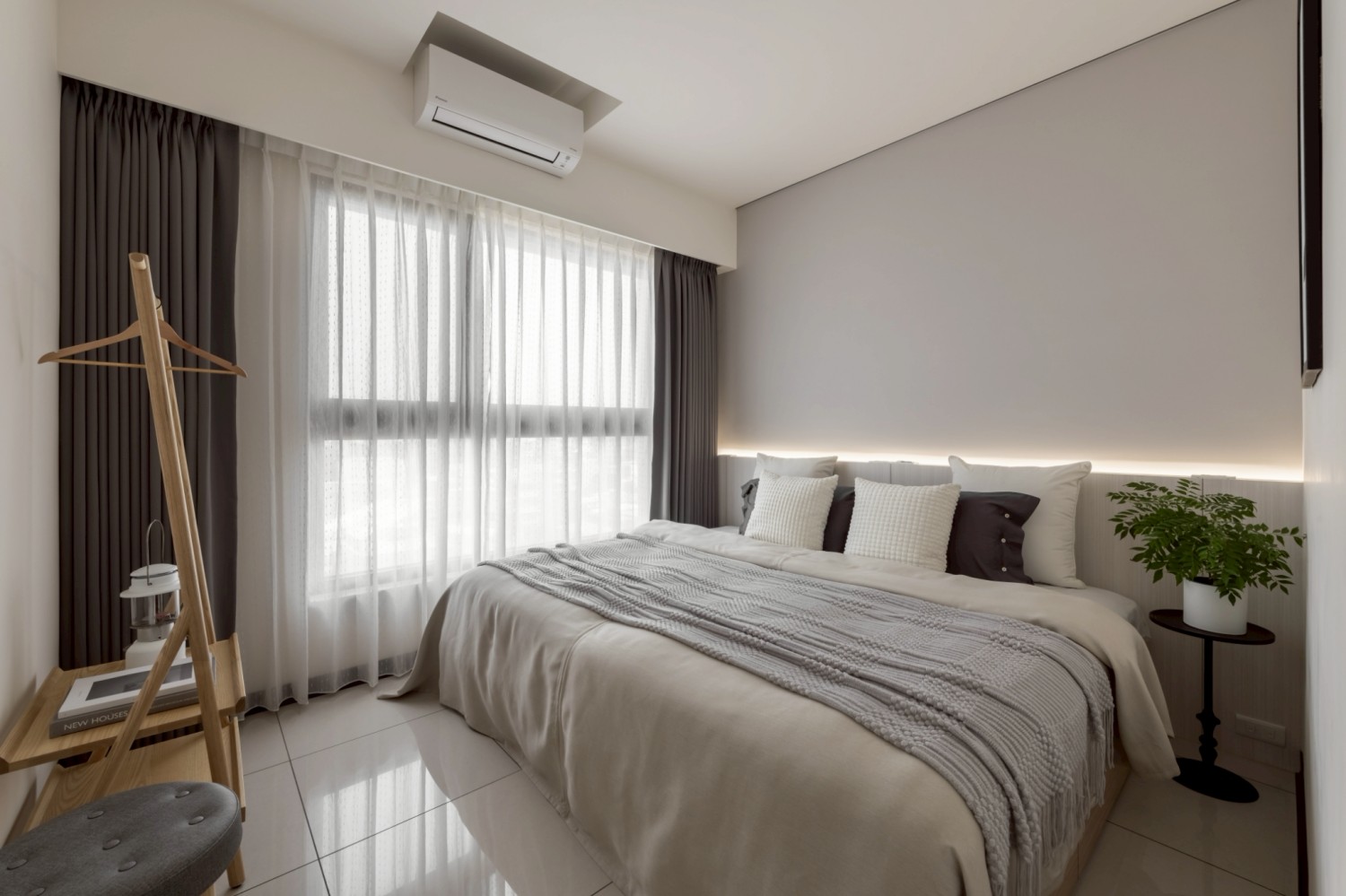 In the bedroom, a misty gray headboard wall anchors the space, while a concealed light strip at mid-height emits a soft glow. Bathed in natural light, the space exudes a tranquil and airy atmosphere.