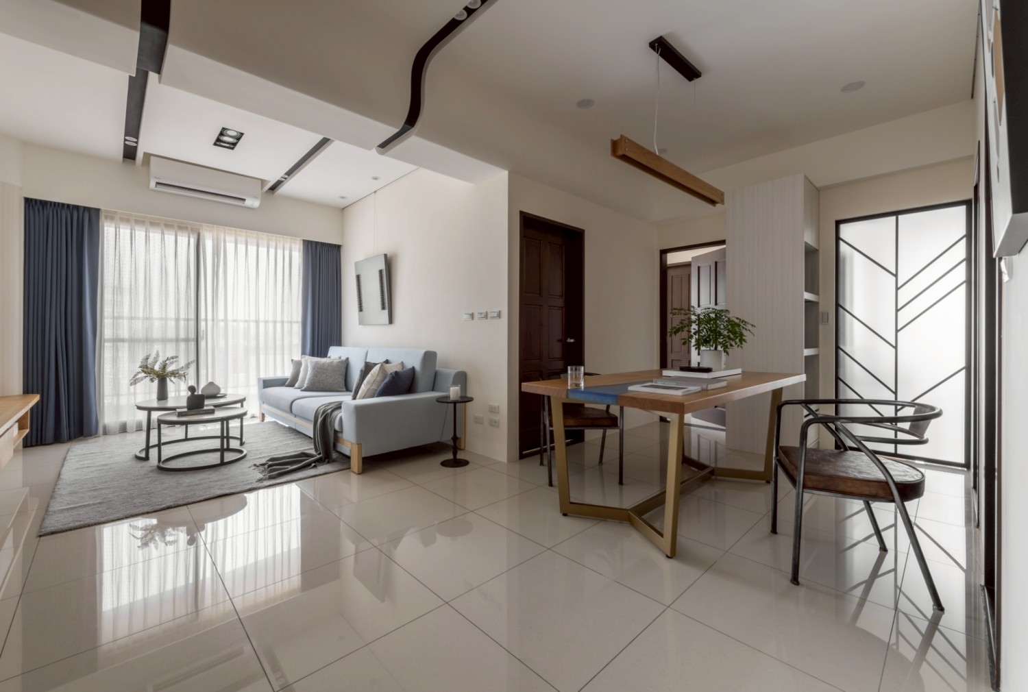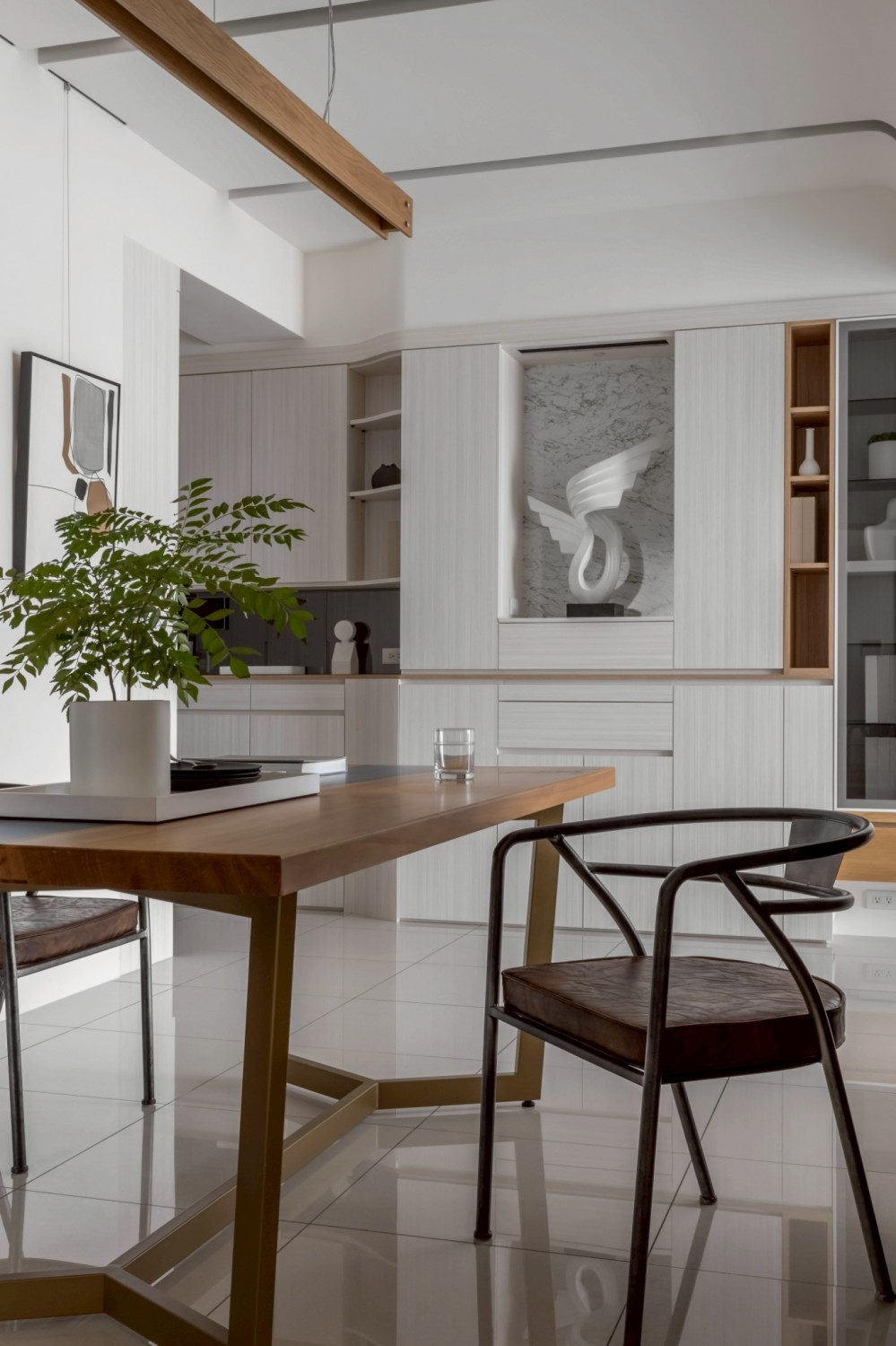 Situated in a zone with limited daylight, the dining room requires clever design strategies to elevate its sense of light and space. In response, the kitchen door is replaced with a glass sliding door. It divides a space while maintaining an open and airy feel, acting as a divider without completely blocking the view. Besides, it effectively prevents the spread of cooking fumes while allowing light to enter.