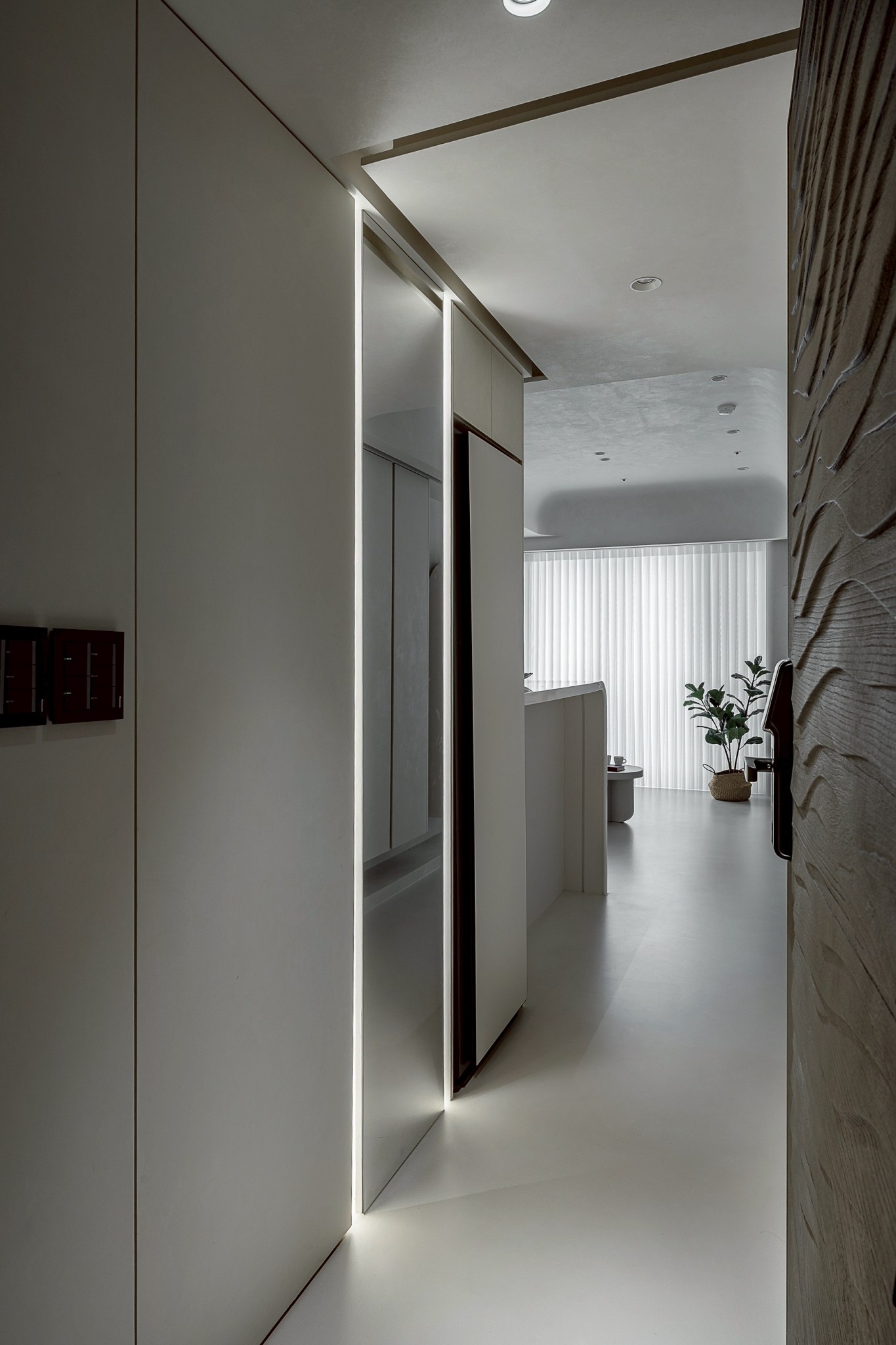 Furthermore, the dining and kitchen area continues to reflect the same minimalist color palette established in the living room, creating a cohesive aesthetic throughout. The kitchen island and appliances are meticulously arranged not only to promote efficiency but also to harmonize with the surrounding streamlined design, ensuring a visually unified appearance. As transitioning to the bedrooms, one will find that these spaces maintain the main color scheme while incorporating gentle curves and soft lighting details. Together, these design choices foster a serene resting environment that not only enhances comfort but also nurtures a sense of enclosure and privacy, making it an ideal sanctuary for relaxation.
