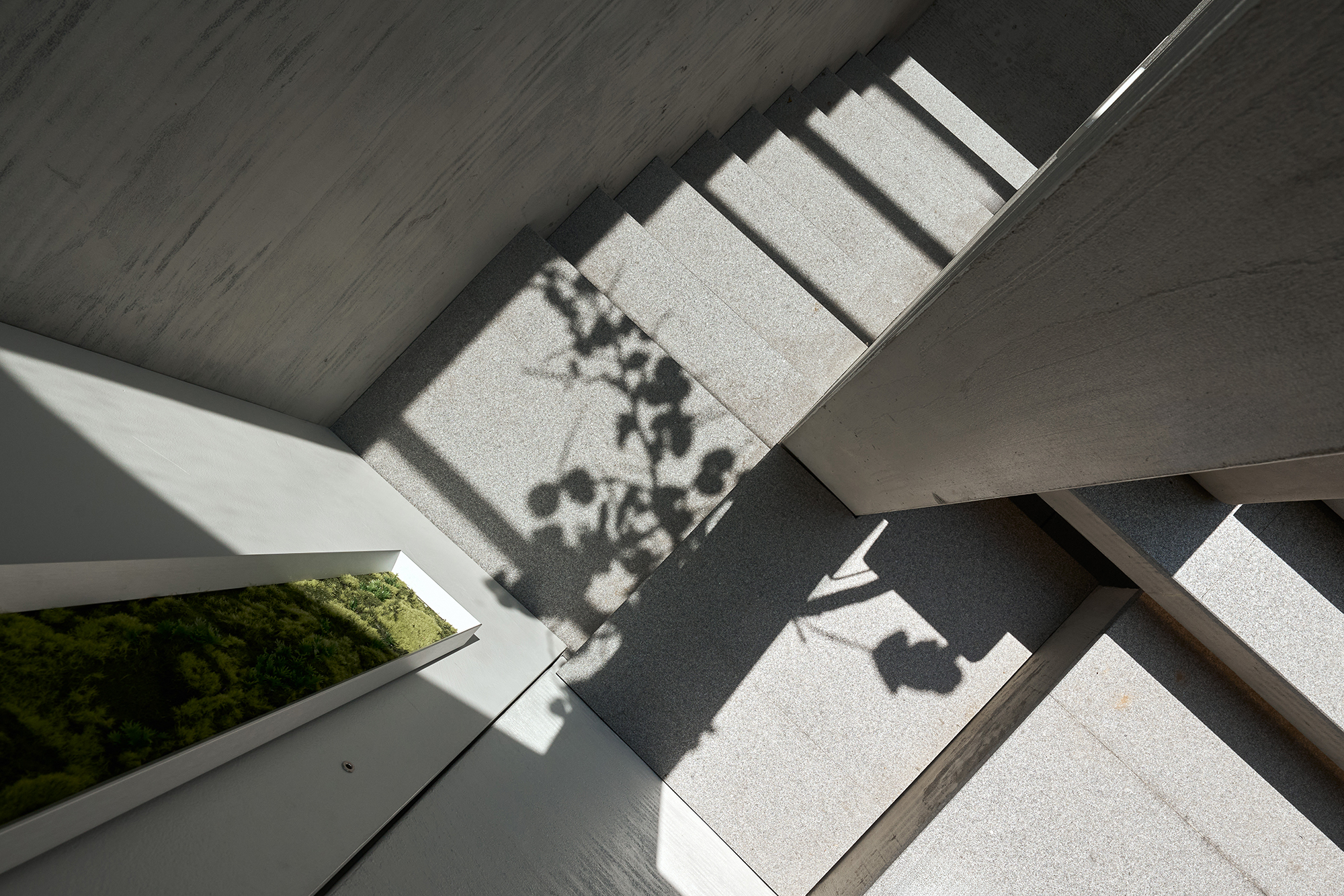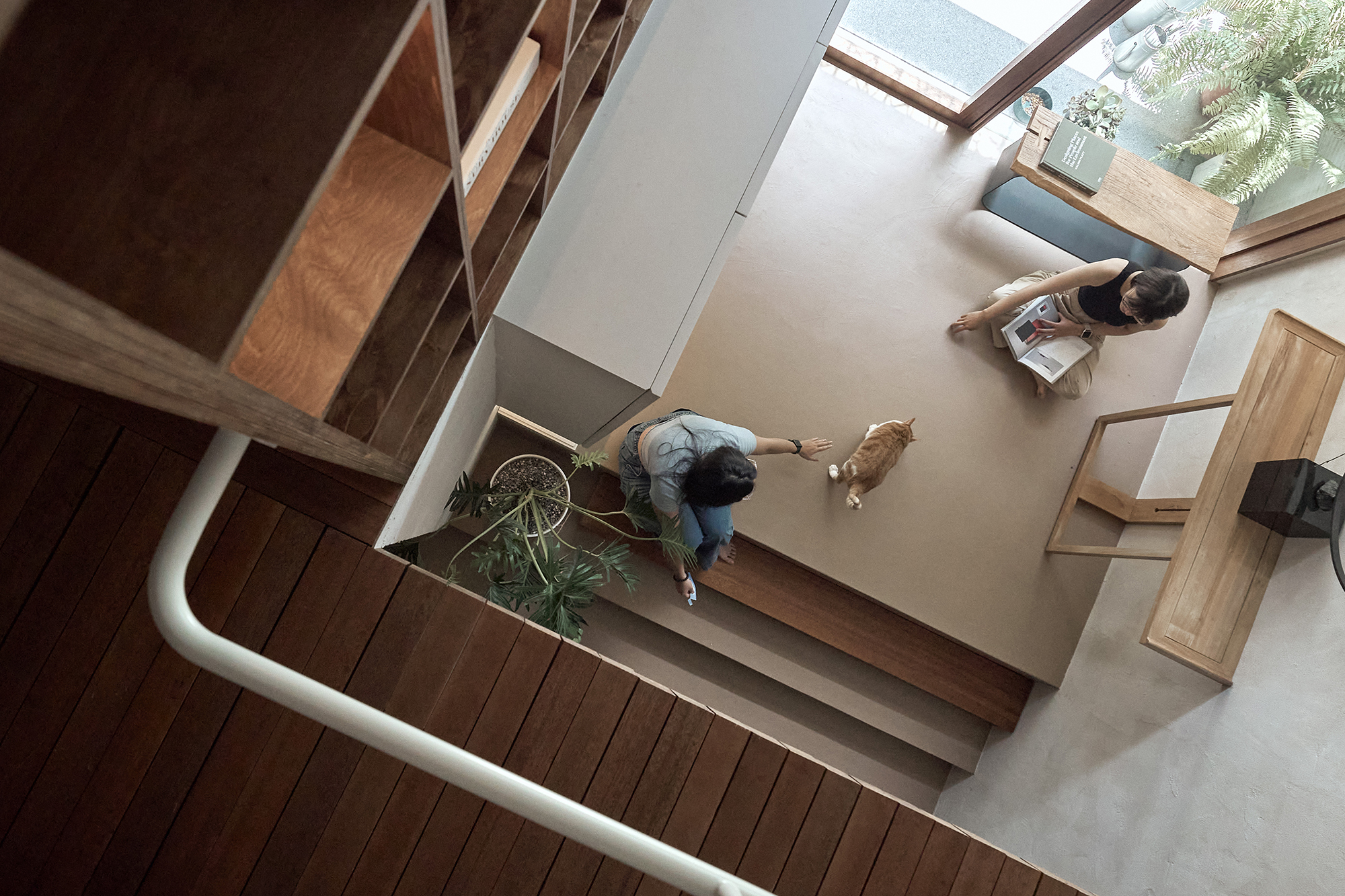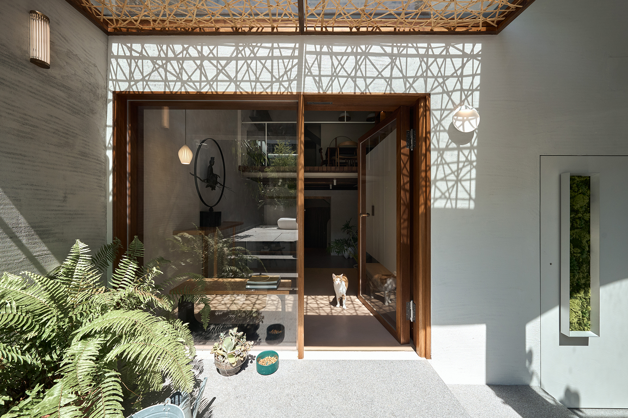 As visitors gracefully ascend the outdoor staircase, they are greeted by a striking moss-covered painting at the top, artfully concealing a storage room that has been masterfully transformed from the original building's main entrance. Upon reaching the first floor, they notice that the windows have been redesigned into impressive floor-to-ceiling entrance windows, enhanced by elegantly woven bamboo ceilings that beautifully guide the light and draw the eye in captivating directions. Moreover, the parapet walls have been thoughtfully elevated to obscure the cluttered view of the street, creating a serene atmosphere. This design seamlessly connects the entrance flow to the inviting terrace, making the lush greenery a prominent focal point of the experience. Continuing through the entrance, visitors discover a multifunctional relaxation area, where staggered steps serve a dual purpose as comfortable seating, offering versatile usage options for various gatherings. The open-plan layout, characterized by a soaring ceiling that spans both the first and second floors, further enhances spatial transparency and fosters a sense of interaction among the spaces. This harmonious design not only invites exploration but also cultivates a warm, welcoming environment for all who enter.