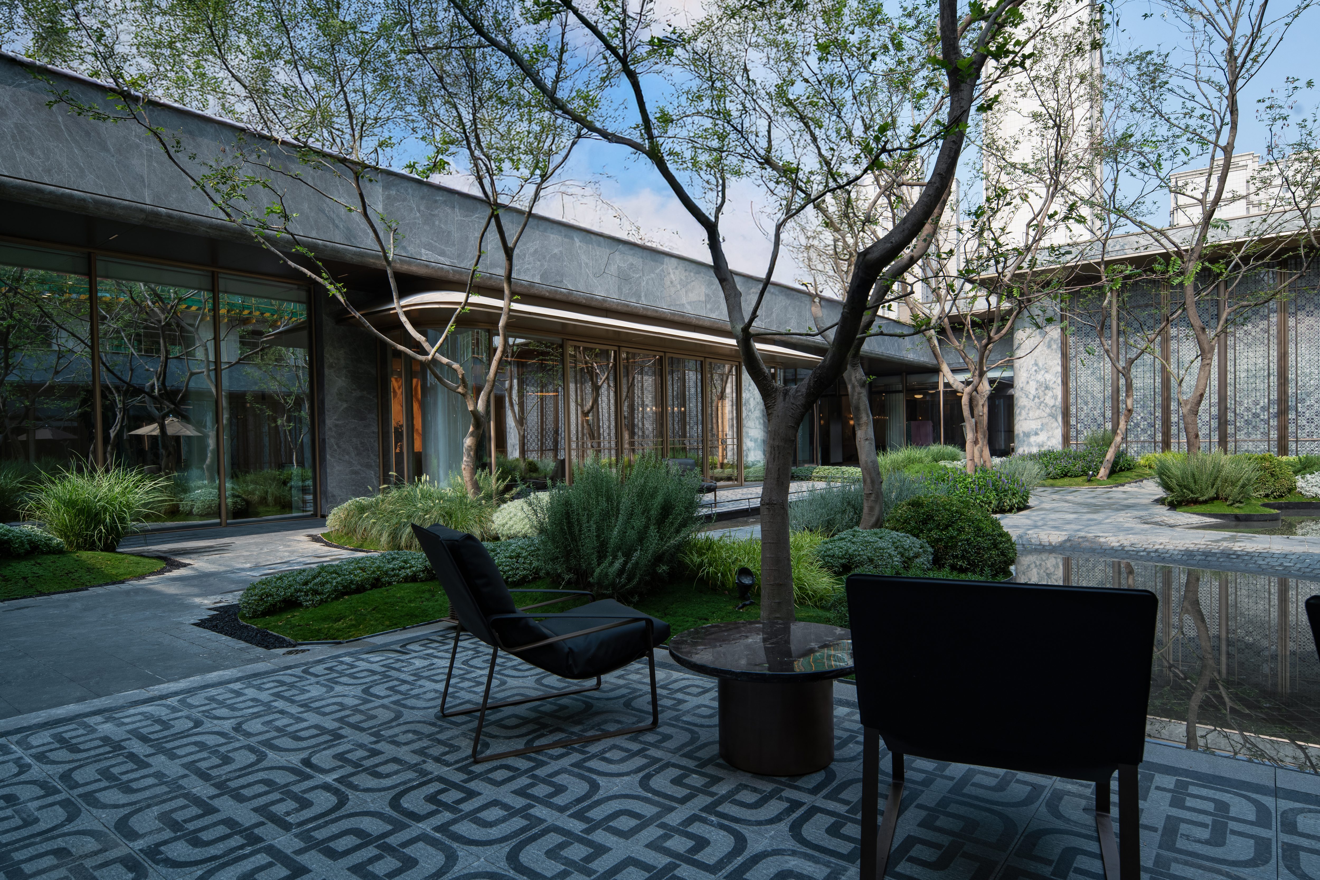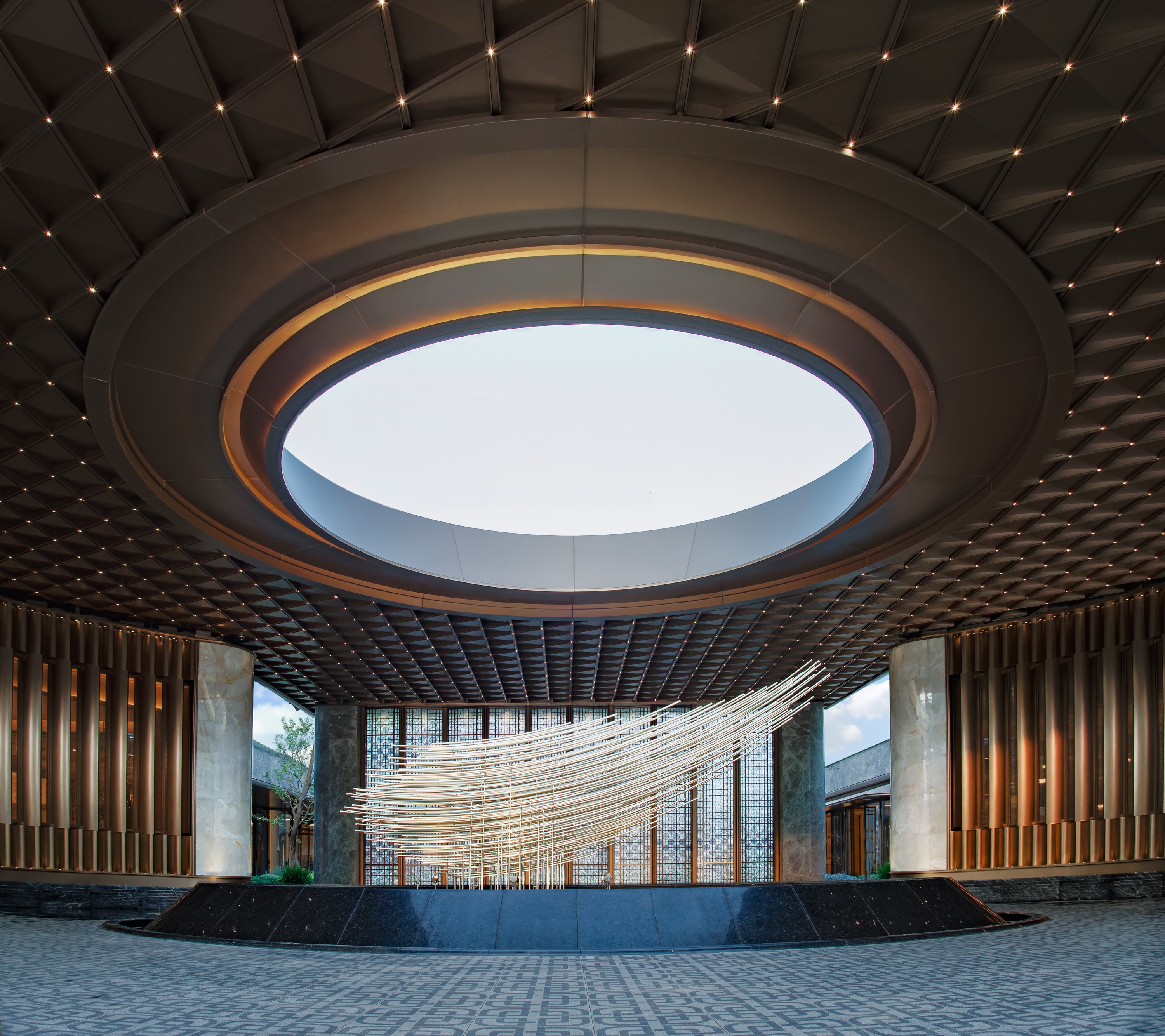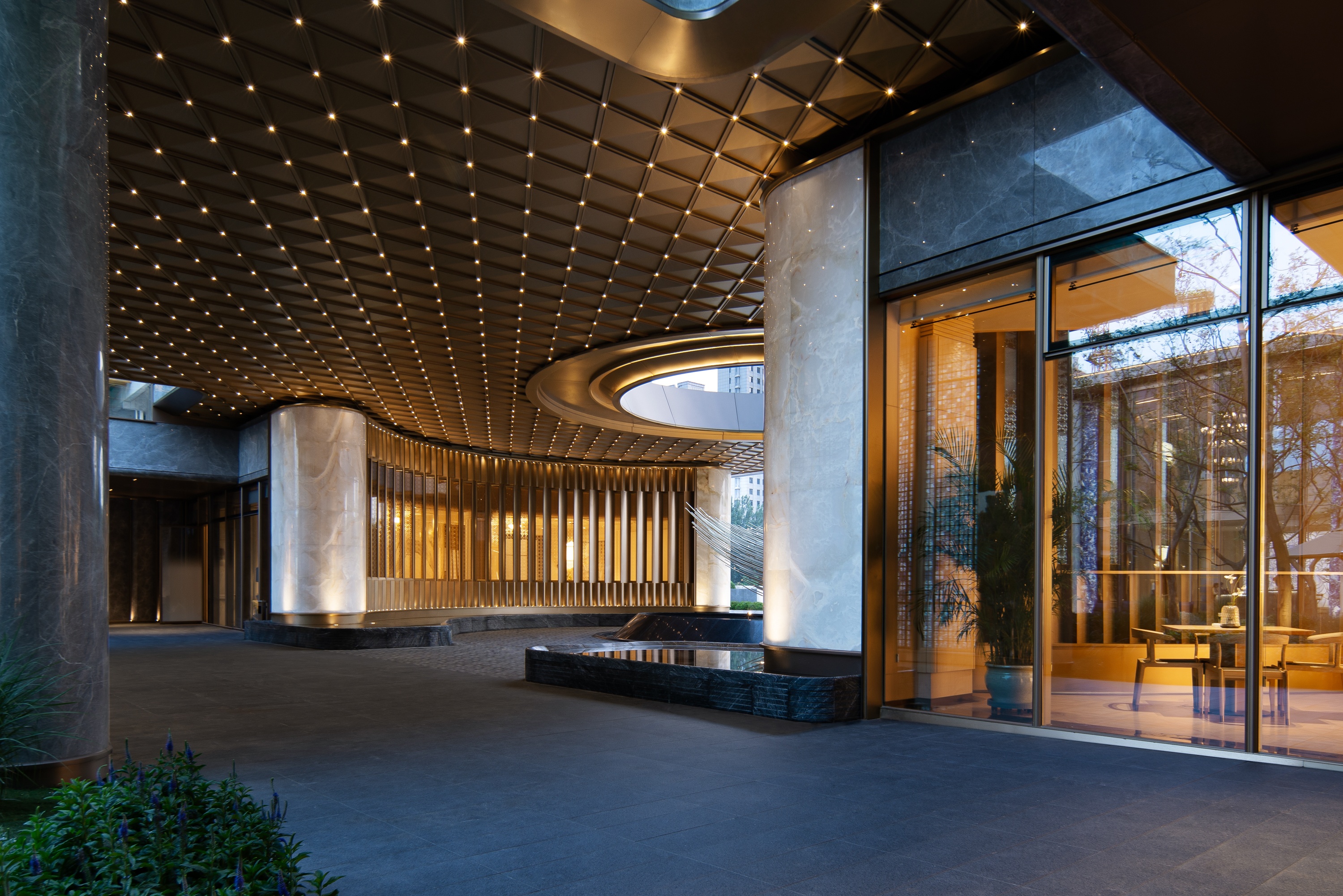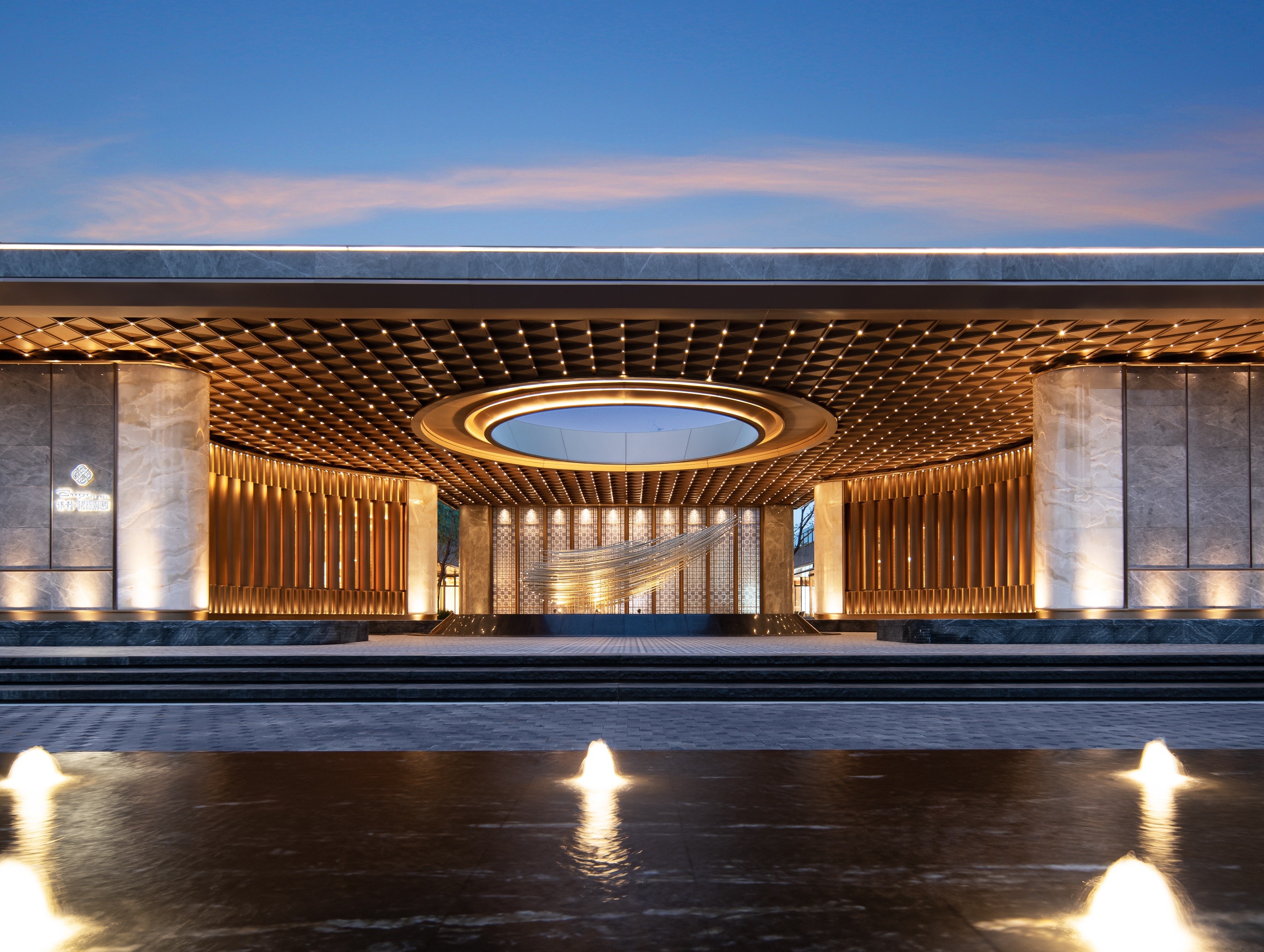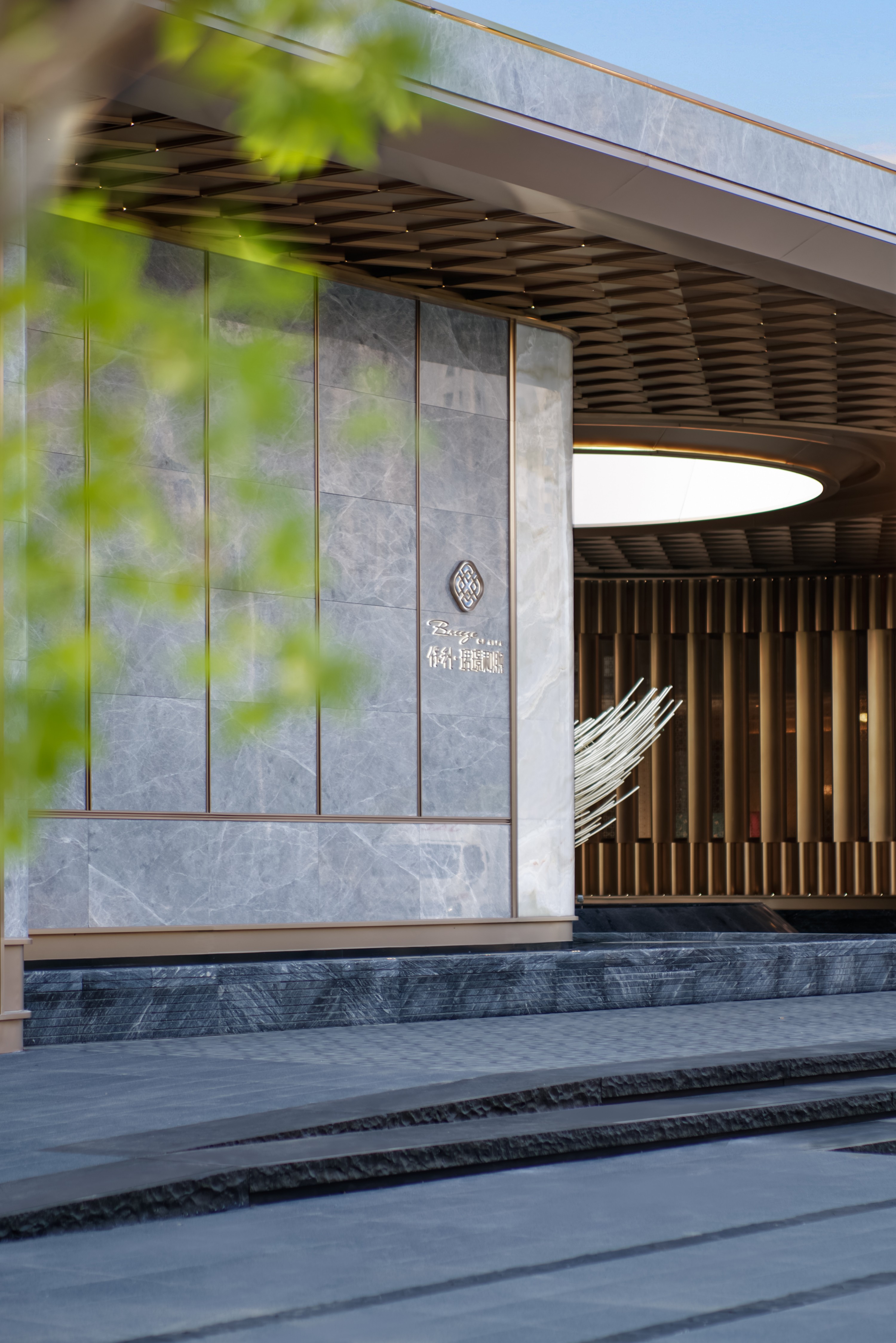 The design constructs a strong visual identity through an architectural form full of sculptural sense. The main body adopts a symmetrical layout, and creates a homecoming ritual through the ceremonial order of three progressive spaces: the first space is a dignified entrance, the second space builds the "Heshi Market" central courtyard, and the third space integrates a warm lobby. These spaces progress layer by layer, integrating the elegance of the city with the relaxation of nature. On both sides of the building, six abstract volumes decorated with jade materials are embedded, like inlaid gemstones, echoing the "Junjing" theme (where "Junjing" refers to fine jade, a nod to the "fine jade" imagery in the poetic phrase). The rounded chamfering treatment weakens the boundaries of the volumes and enhances the sense of flow and exquisiteness. The central curved landscape wall is composed of alternating stainless steel units and strip-shaped glass, creating a visually transparent effect with "different views from different angles". The ceiling design and the enamel screen complement each other, implying the scene of "sky light and cloud shadows" and highlighting the concept of the integration of yin and yang.