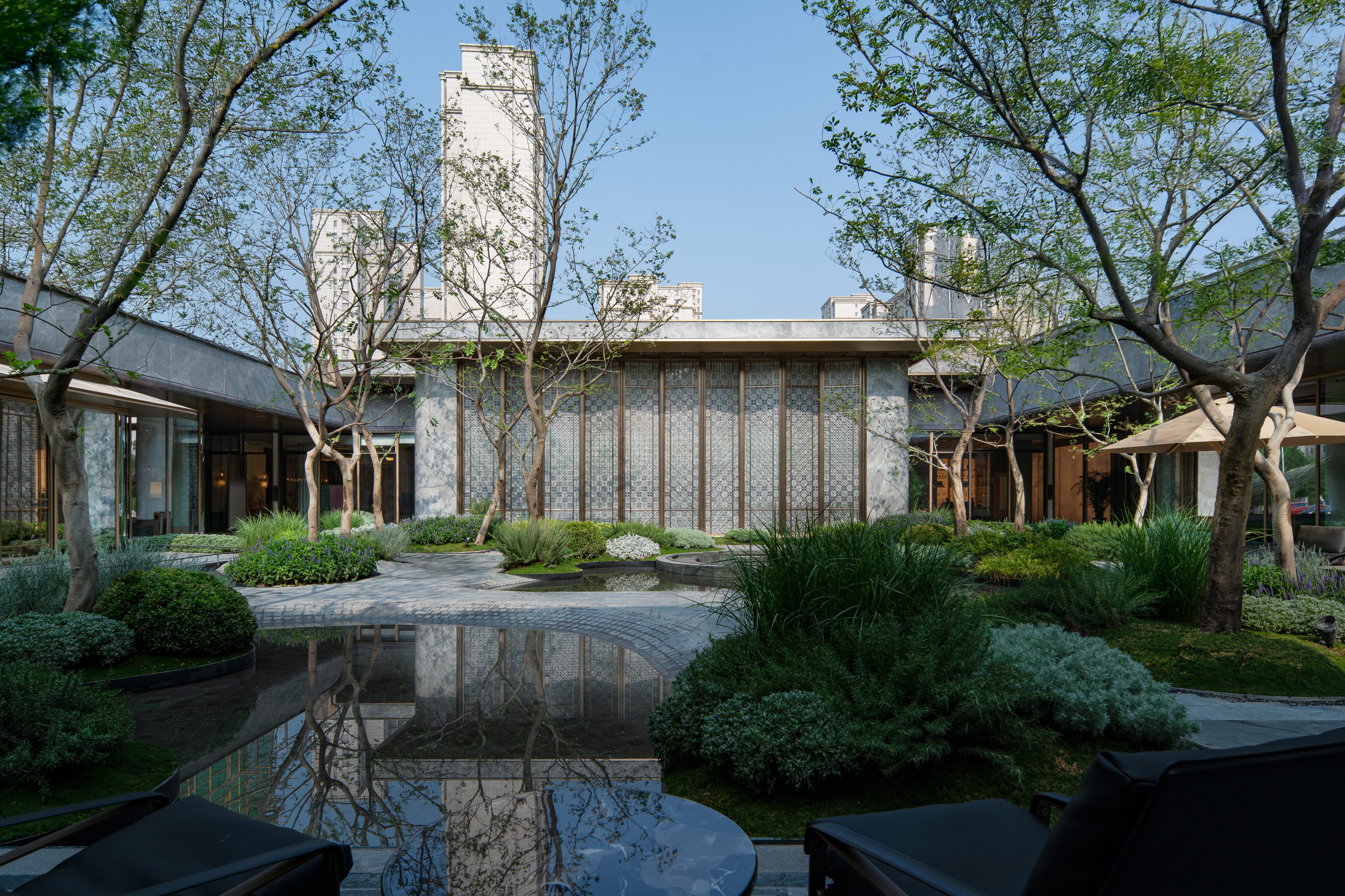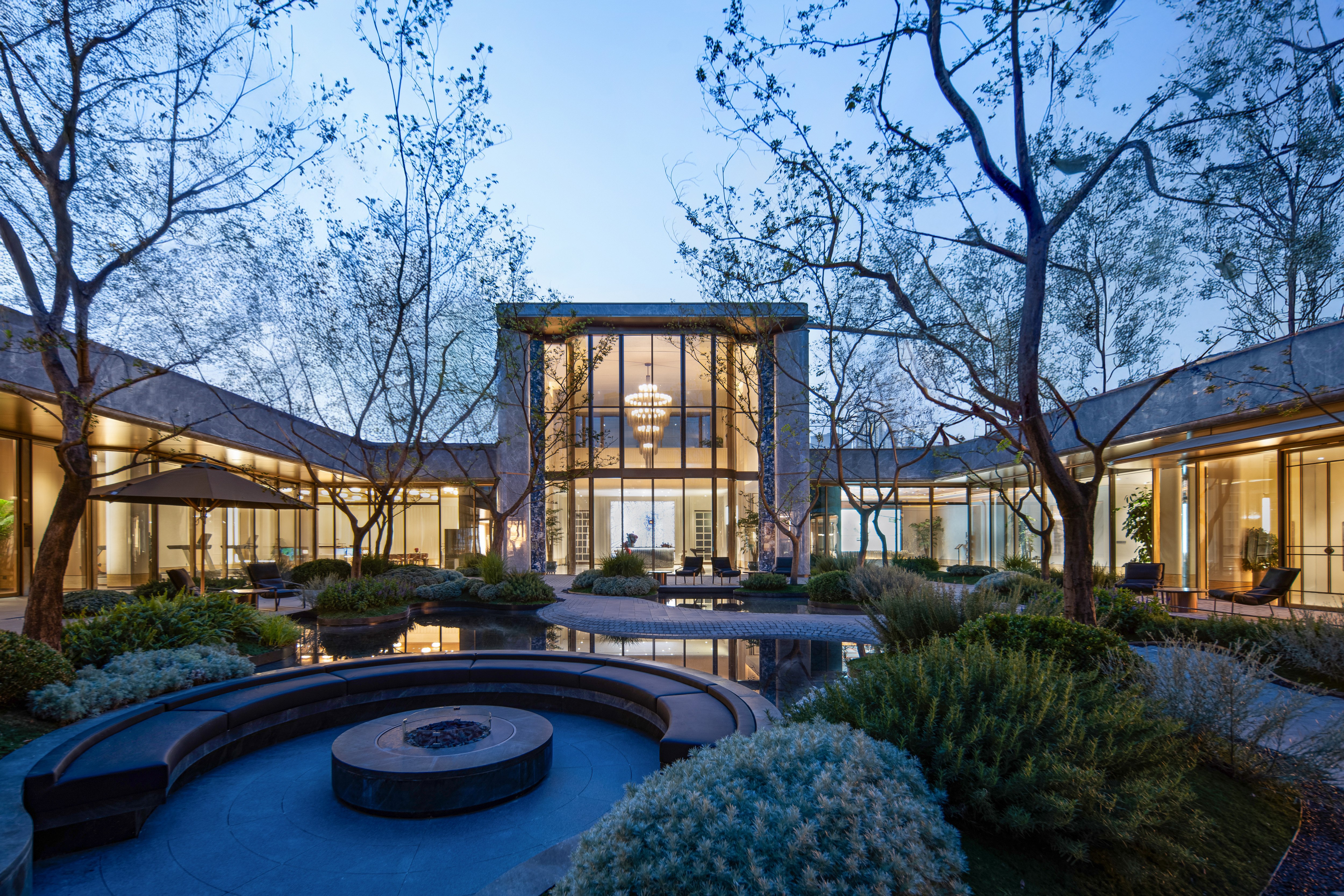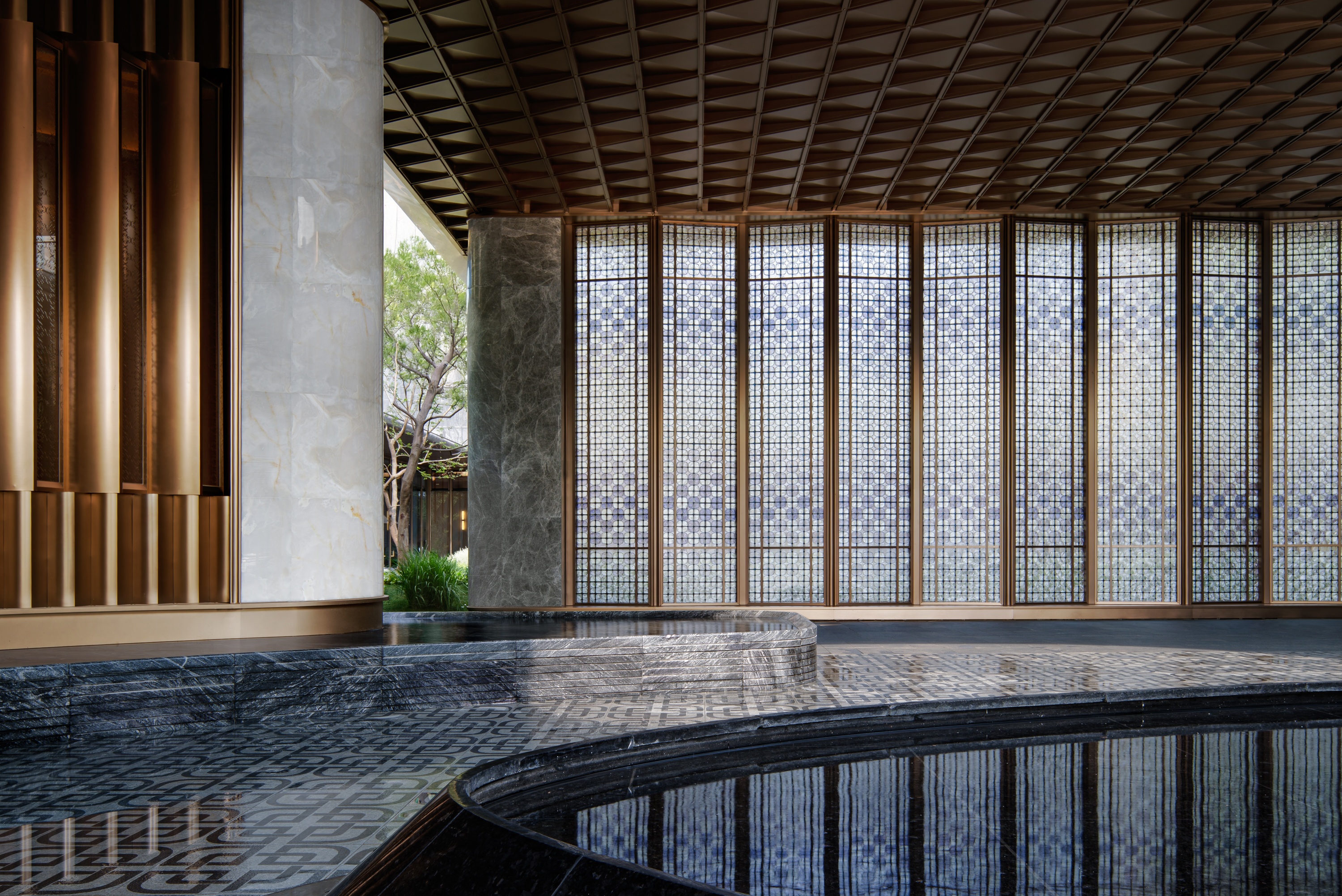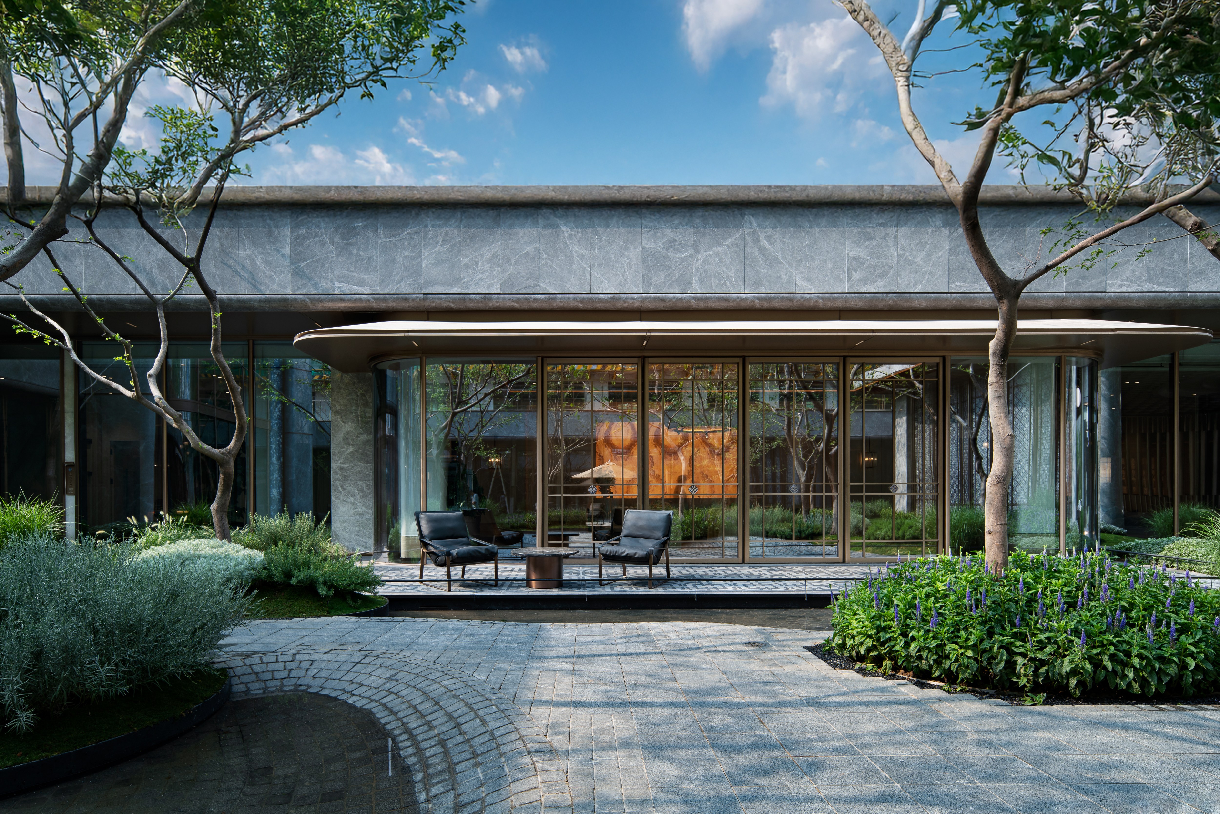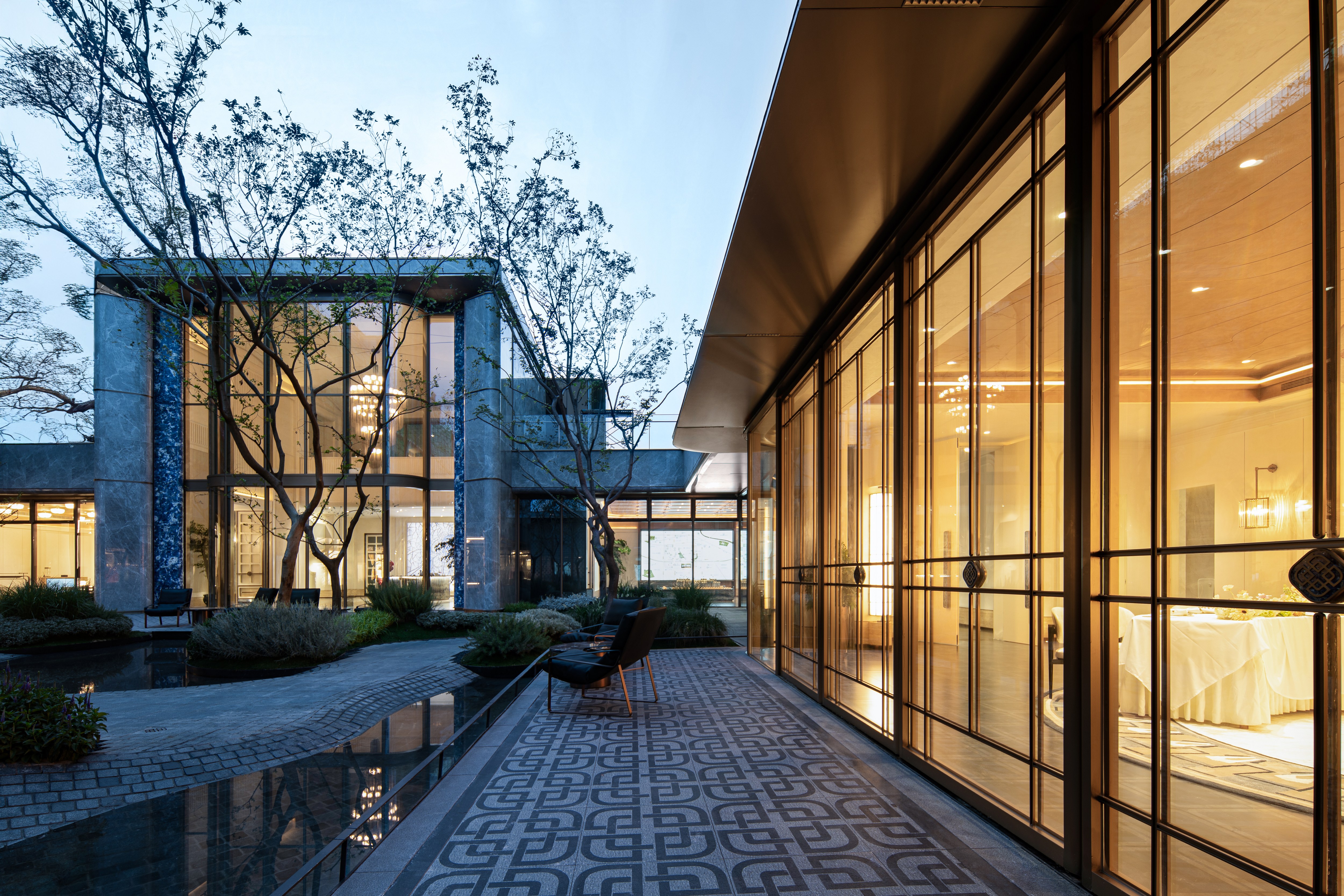 The design constructs a strong visual identity through an architectural form full of sculptural sense. The main body adopts a symmetrical layout, and creates a homecoming ritual through the ceremonial order of three progressive spaces: the first space is a dignified entrance, the second space builds the "Heshi Market" central courtyard, and the third space integrates a warm lobby. These spaces progress layer by layer, integrating the elegance of the city with the relaxation of nature. On both sides of the building, six abstract volumes decorated with jade materials are embedded, like inlaid gemstones, echoing the "Junjing" theme (where "Junjing" refers to fine jade, a nod to the "fine jade" imagery in the poetic phrase). The rounded chamfering treatment weakens the boundaries of the volumes and enhances the sense of flow and exquisiteness. The central curved landscape wall is composed of alternating stainless steel units and strip-shaped glass, creating a visually transparent effect with "different views from different angles". The ceiling design and the enamel screen complement each other, implying the scene of "sky light and cloud shadows" and highlighting the concept of the integration of yin and yang.