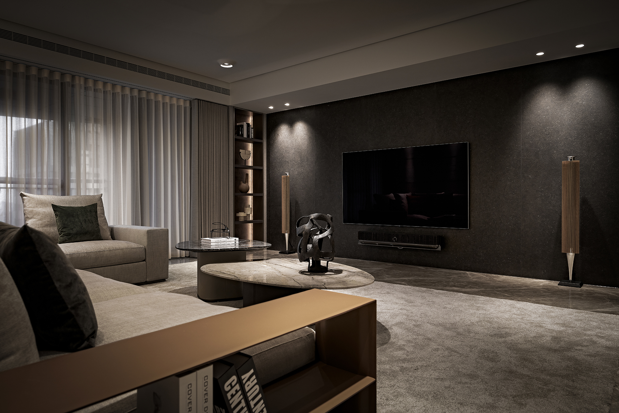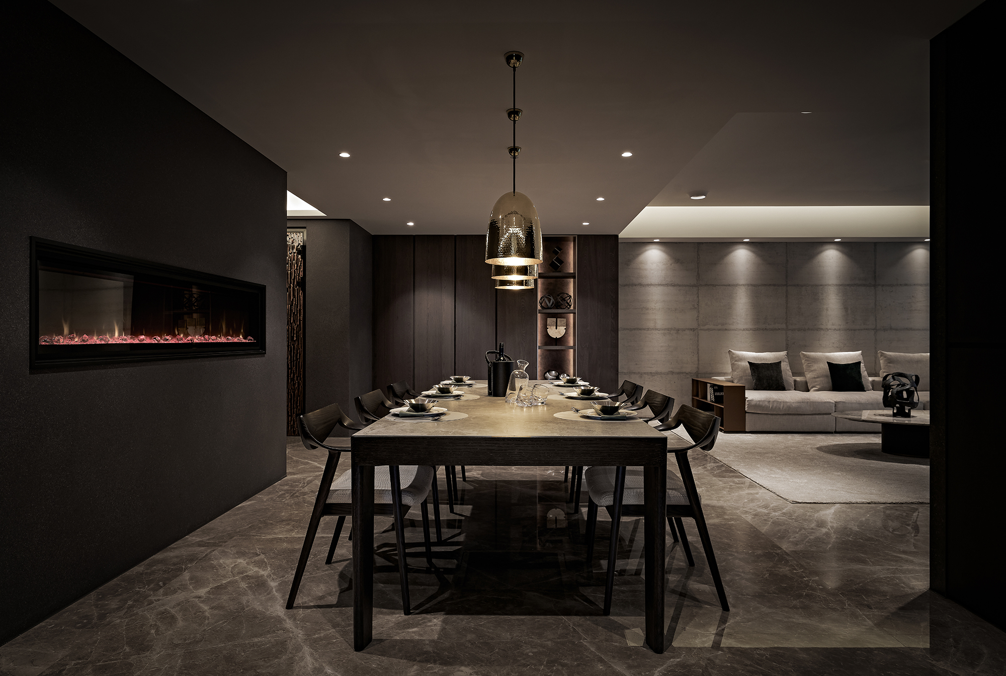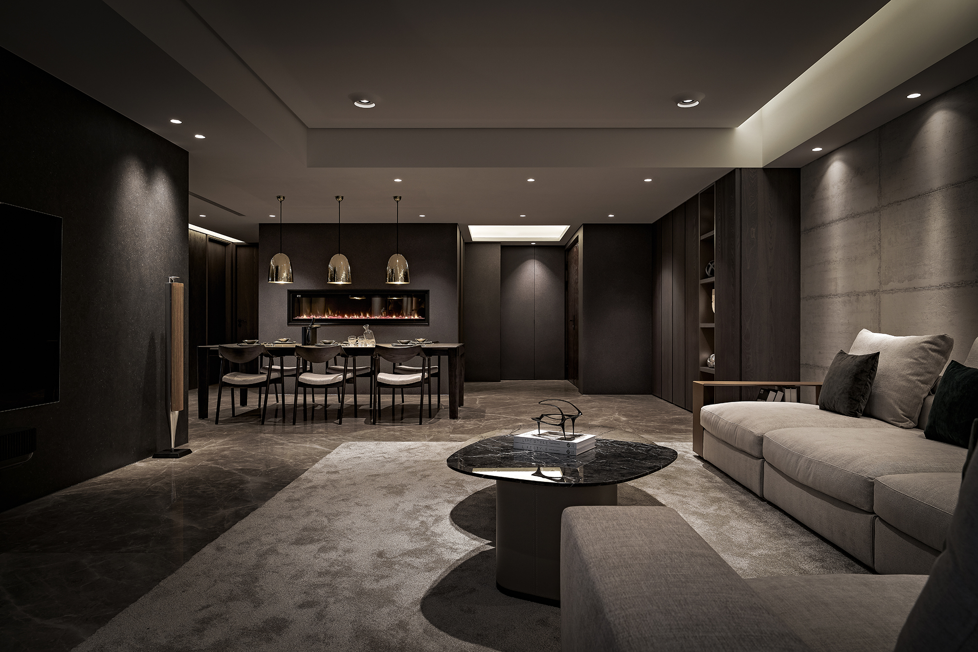 The exterior features a dark color palette that combines sleek metal with the warm texture of wood, achieving a modern industrial aesthetic. Contrasting materials, including brushed white elm wood veneer, marble, and aluminum alloy frames, enhance the design's character and warmth. The emphasis on proportion and meticulous craftsmanship fosters spatial balance and harmony, highlighting the interplay between hard and soft elements. This thoughtful design approach results in a striking yet welcoming environment.