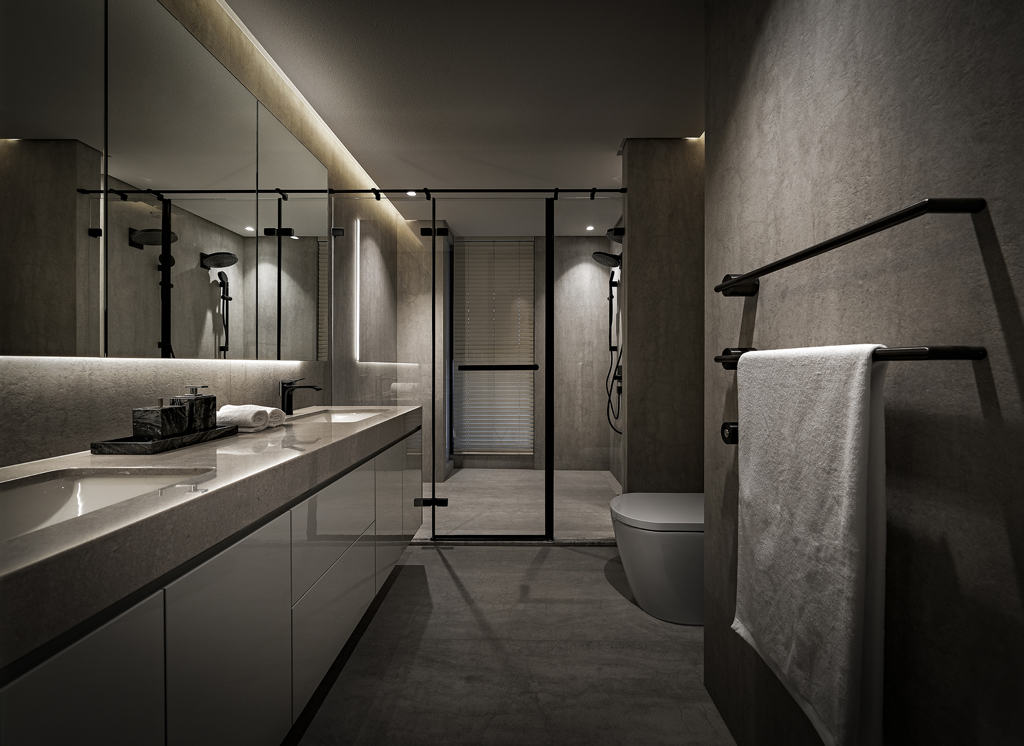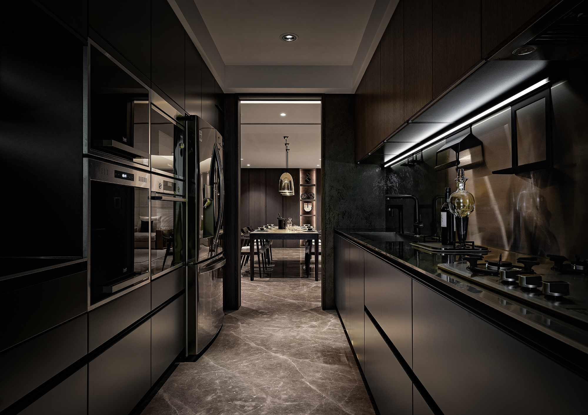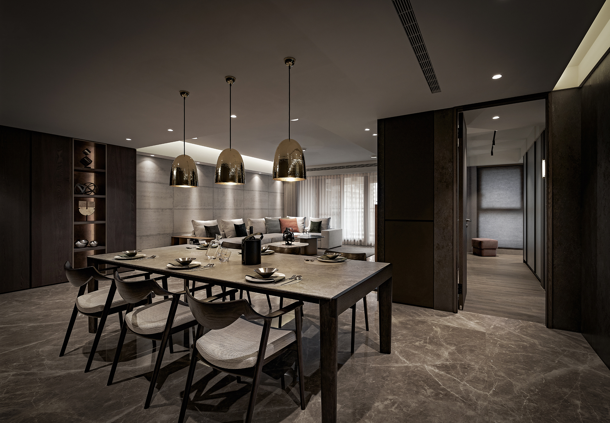 The exterior features a dark color palette that combines sleek metal with the warm texture of wood, achieving a modern industrial aesthetic. Contrasting materials, including brushed white elm wood veneer, marble, and aluminum alloy frames, enhance the design's character and warmth. The emphasis on proportion and meticulous craftsmanship fosters spatial balance and harmony, highlighting the interplay between hard and soft elements. This thoughtful design approach results in a striking yet welcoming environment.