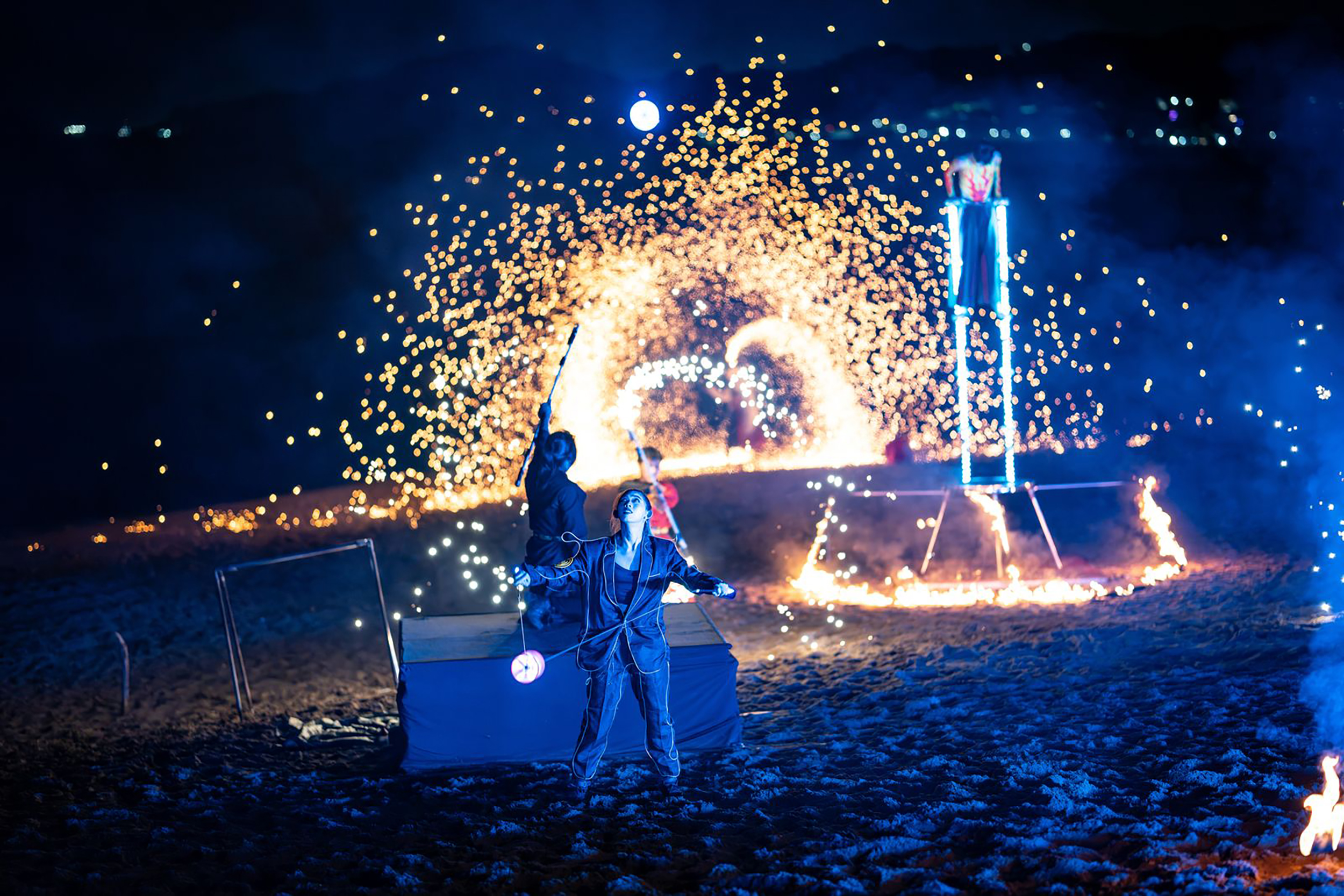 The 2025 North Coast Light Festival is not merely an event but a multi-layered site-specific theater. This year, Jinshan Zhongjiao Bay Beach became a natural stage, with the ocean as its infinite backdrop and fire-dance troupes performing to the rhythm of the waves. For the first time, three top-tier performance groups came together: local troupe Circus Gate, fire-dance specialists TRUE SPIN, and Hong Kong’s Flow Space Studio. Each created original programs in their own artistic expressions while engaging in cross-disciplinary dialogue that sparked new creativity.