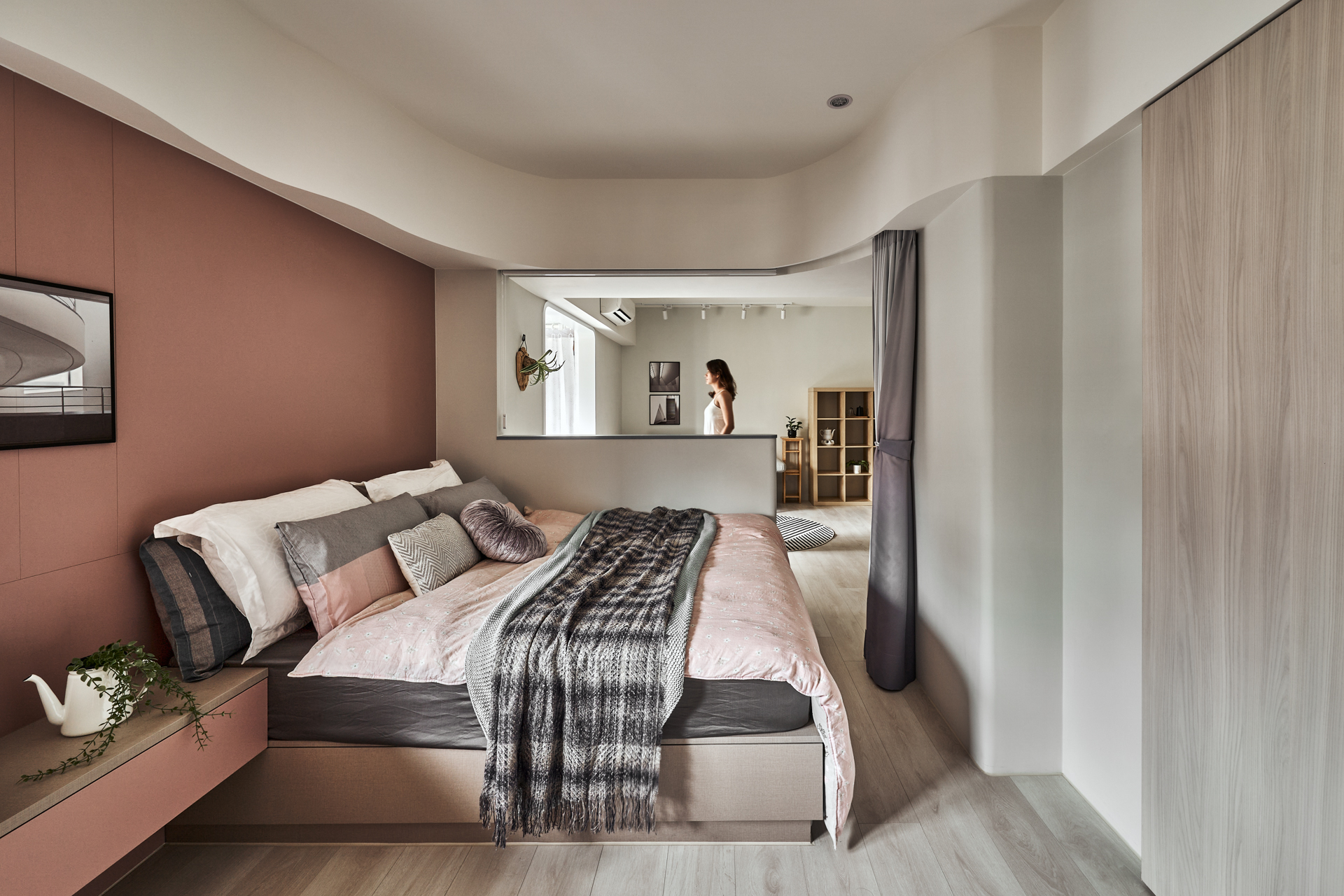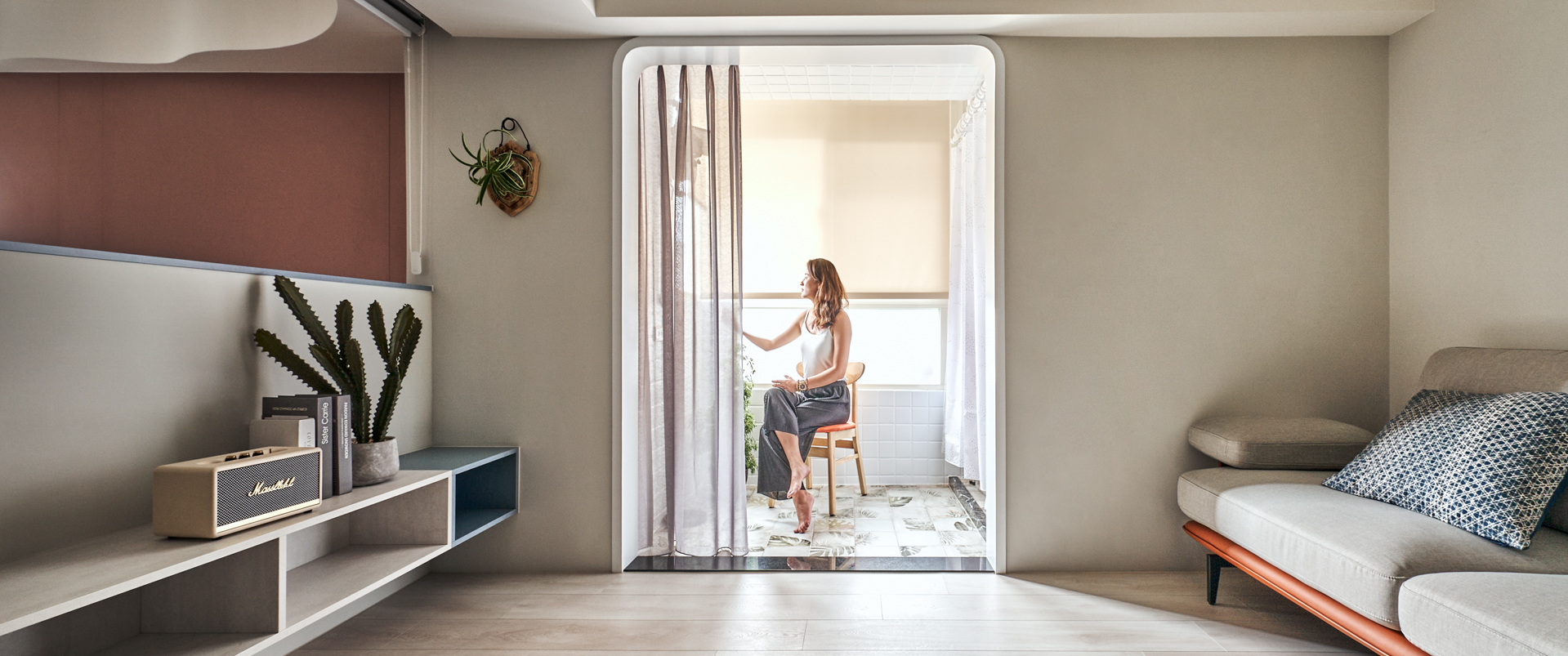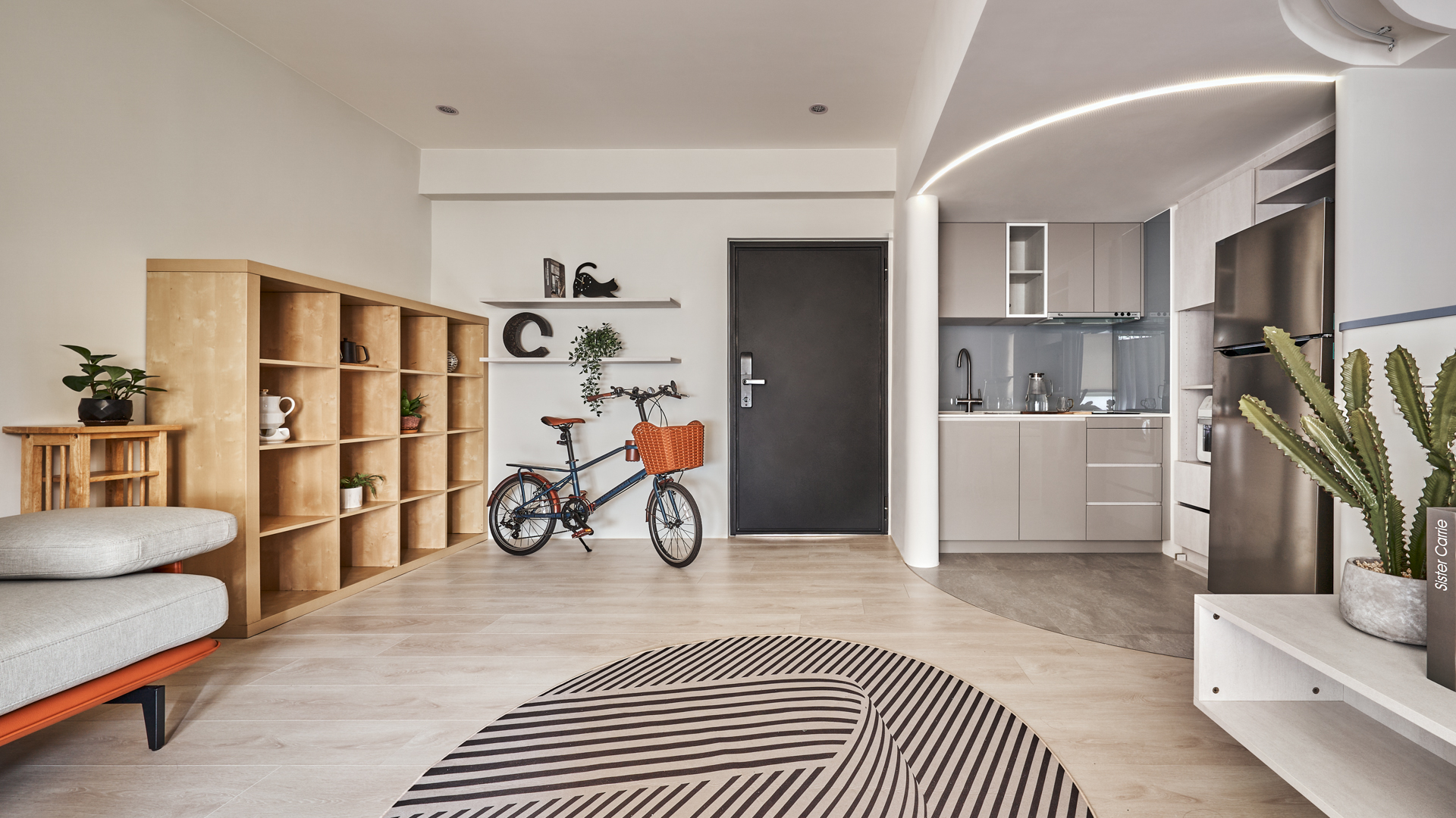 Boundaries between functions were softened, allowing no zone to stand in isolation. Curves eased transitions between living, dining, and cooking, creating overlaps that shared light and movement within the compact footprint. The former utility balcony was opened to extend the flow of space, dissolving its threshold and drawing daylight deep into the interior. A lighter kitchen configuration improved circulation, while half-height cabinetry and curtains provided flexible separation without enclosure.
