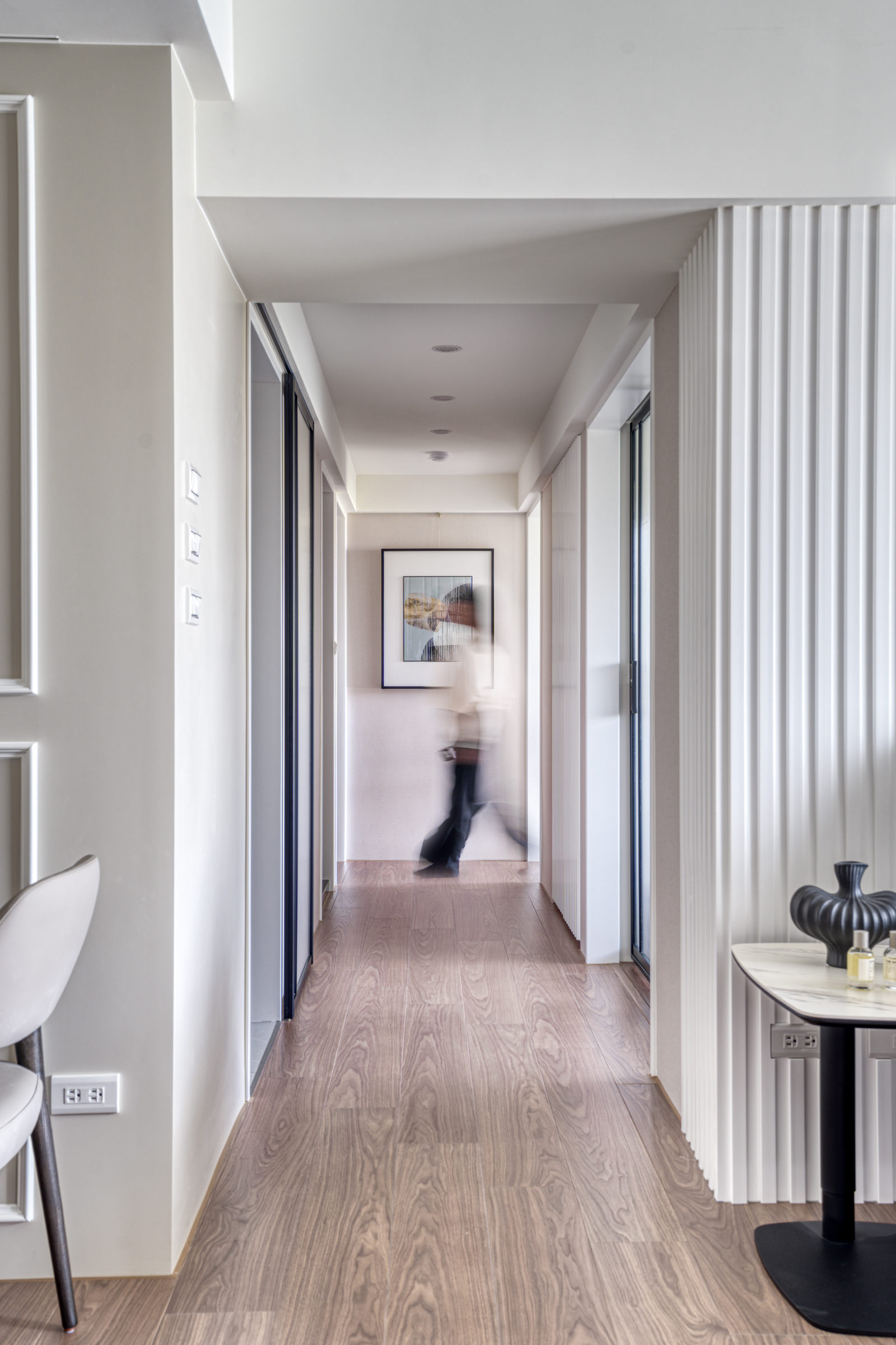 Located in a residential area by the Xindian River in the city, this 10th-floor apartment offers stunning views of the river and urban landscape. The large panoramic windows are designed to allow ample natural light to flood into the interior, enhancing the overall brightness of the space. The design incorporates decorative styles, carefully selected materials, and harmonious color combinations to create a warm and joyful living environment. The color scheme is based on soft neutral tones, complemented by refreshing blue and green hues that echo the river view and natural elements outside. Accents in soft furnishings or warm wooden tones are added to enhance texture and depth. Through the thoughtful arrangement of furniture, the design seamlessly integrates natural light with the beauty of the river view, showcasing the delightful aspects of everyday living.