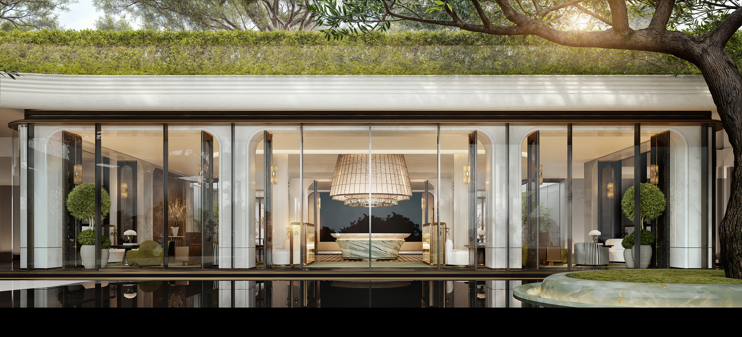 Core Hub:The 5.4-meter-high double-height gatehouse lobby features a backdrop wall composed of 396 Argentine Green carved leaves assembled into 99 flower petals, creating a noble sense of homecoming ritual. Taking the elevator down to the central station, a circular daylight canopy comes into view upon exiting the elevator hall. The main background wall showcases 168 Da Vinci Beige reliefs, layered with jade and metal that emit a subtle glow. The project maximizes the use of curved lines, presenting a sense of soft beauty everywhere.