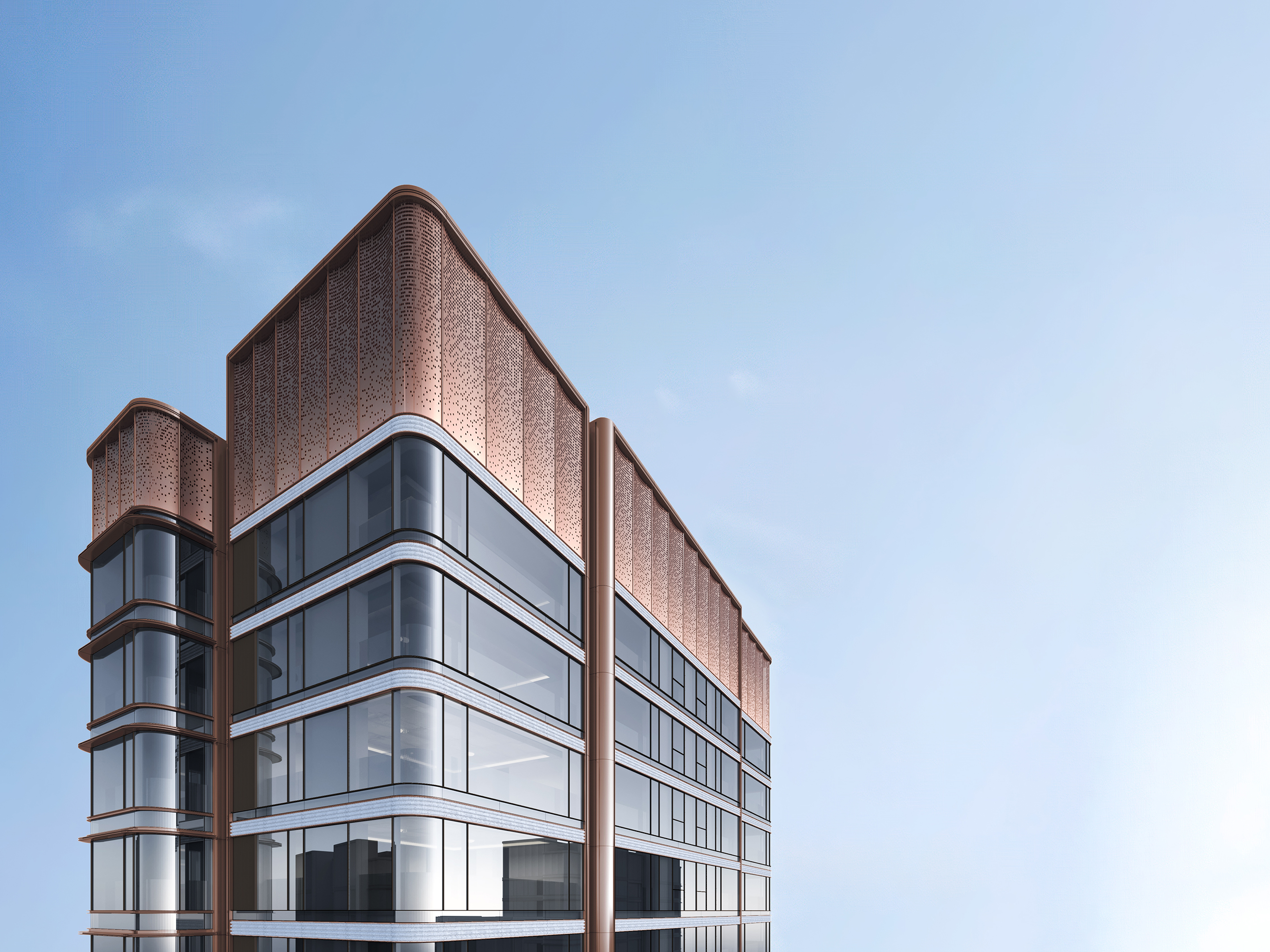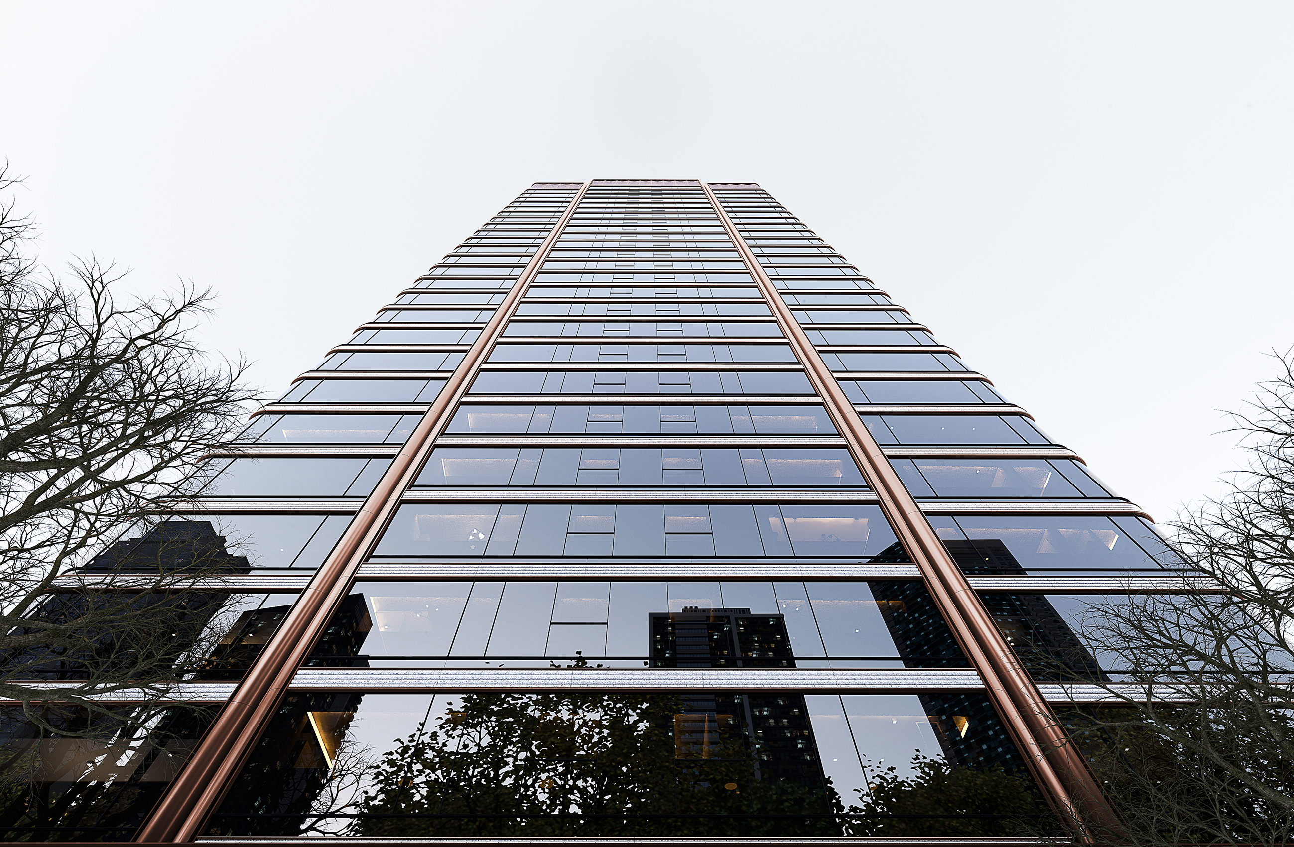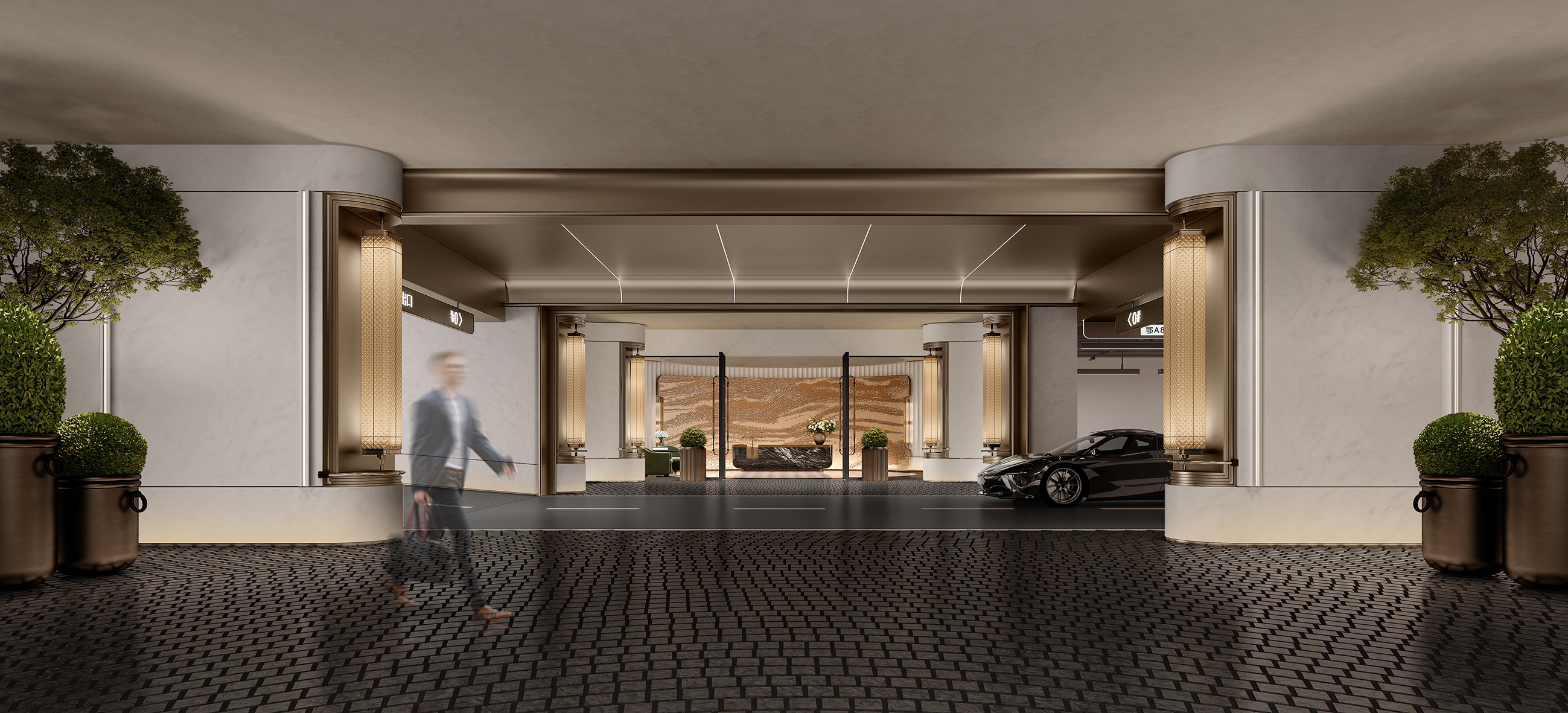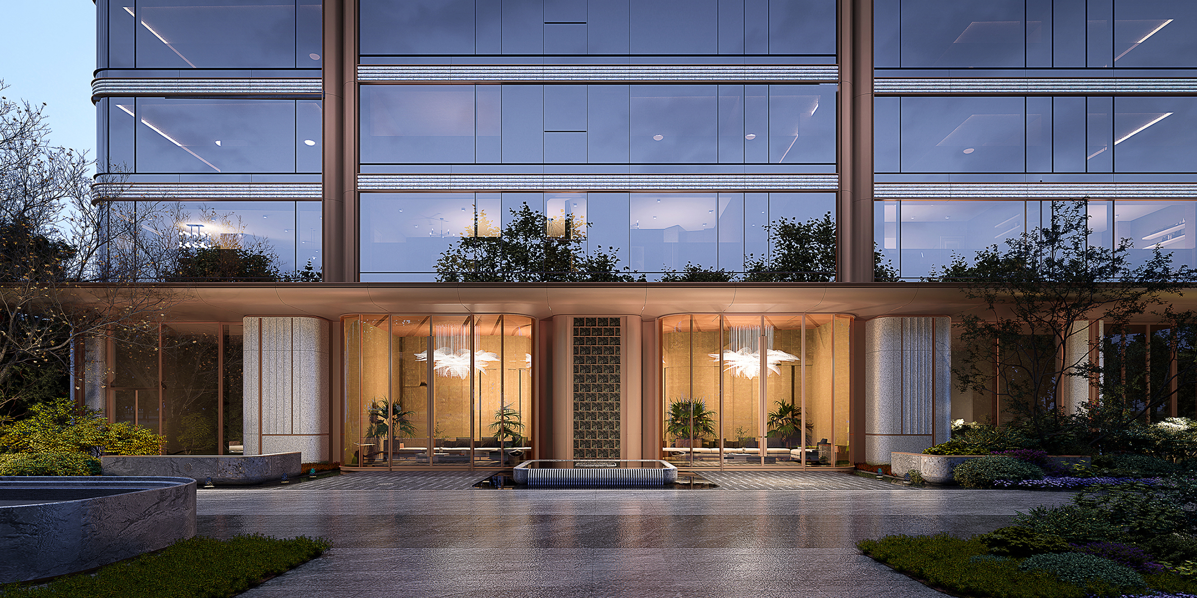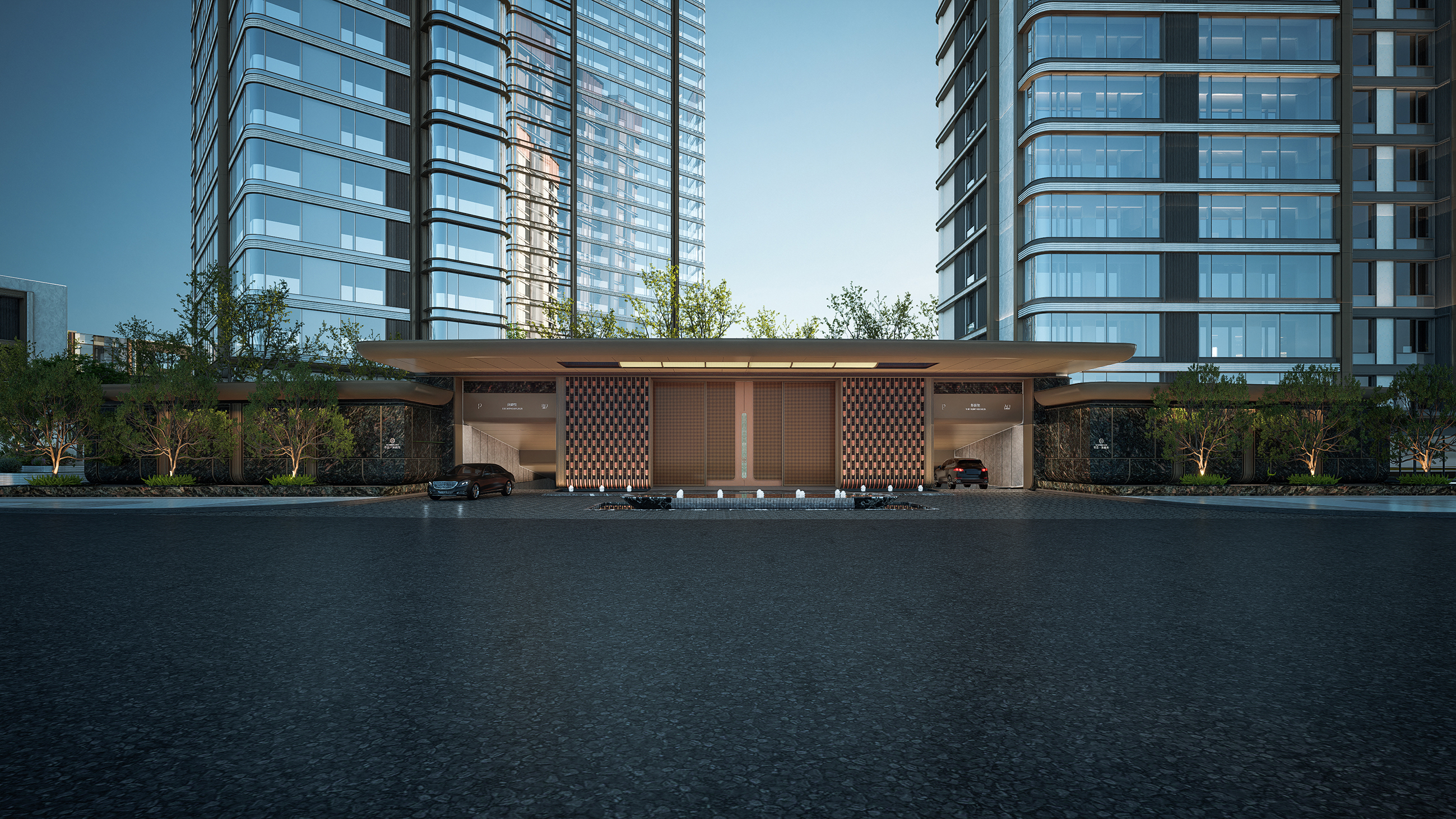 First Interface:The entire gate serves as an elaborately crafted art installation, representing Wuhan's one-of-a-kind prestigious homecoming design. Constructed with copper-like stainless steel, its patterns are extracted from the project logo. The door handles are inlaid with Bulgari Green marble, exuding undeniable luxury and elegance. The entrance feature wall adopts a unique arc process to soften sharp boundaries, paired with the project's custom logo. It perfectly blends THE BUND REGALIA's grand texture with exquisite details, conveying the project's high-end quality and distinctive style through architectural language even before entering the community.