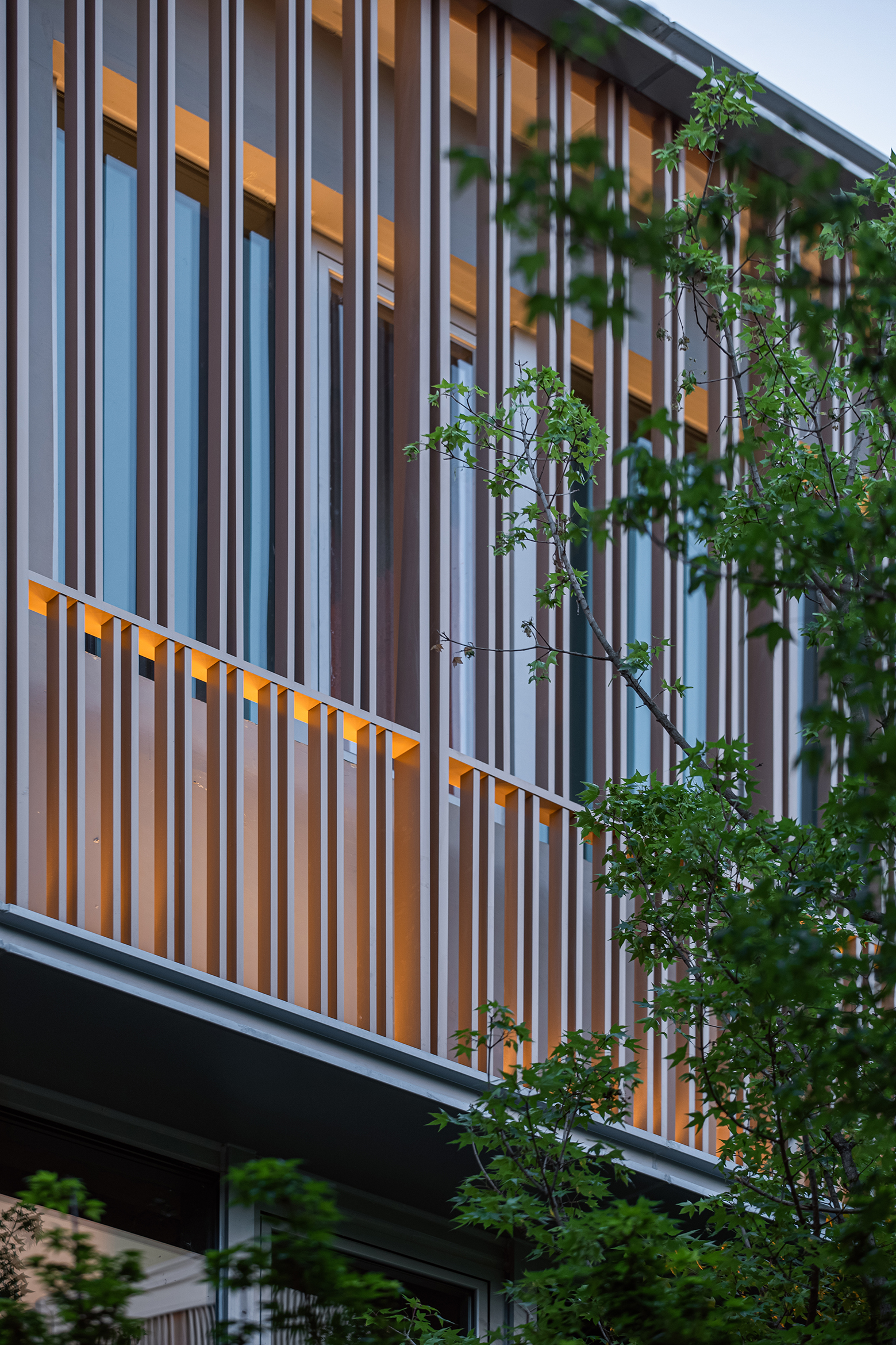 The first realm is the prominent facade. Guanshan Pavilion (Mountain-Viewing Pavilion), the starting point of the homecoming sequence, features three floating volumes supported by a horizontal platform. Stretching along the street and twisting westward to face the mountains, it skillfully connects the boundary between city and nature, creating a striking visual impact and serving as a unique window for the community to engage with the city.