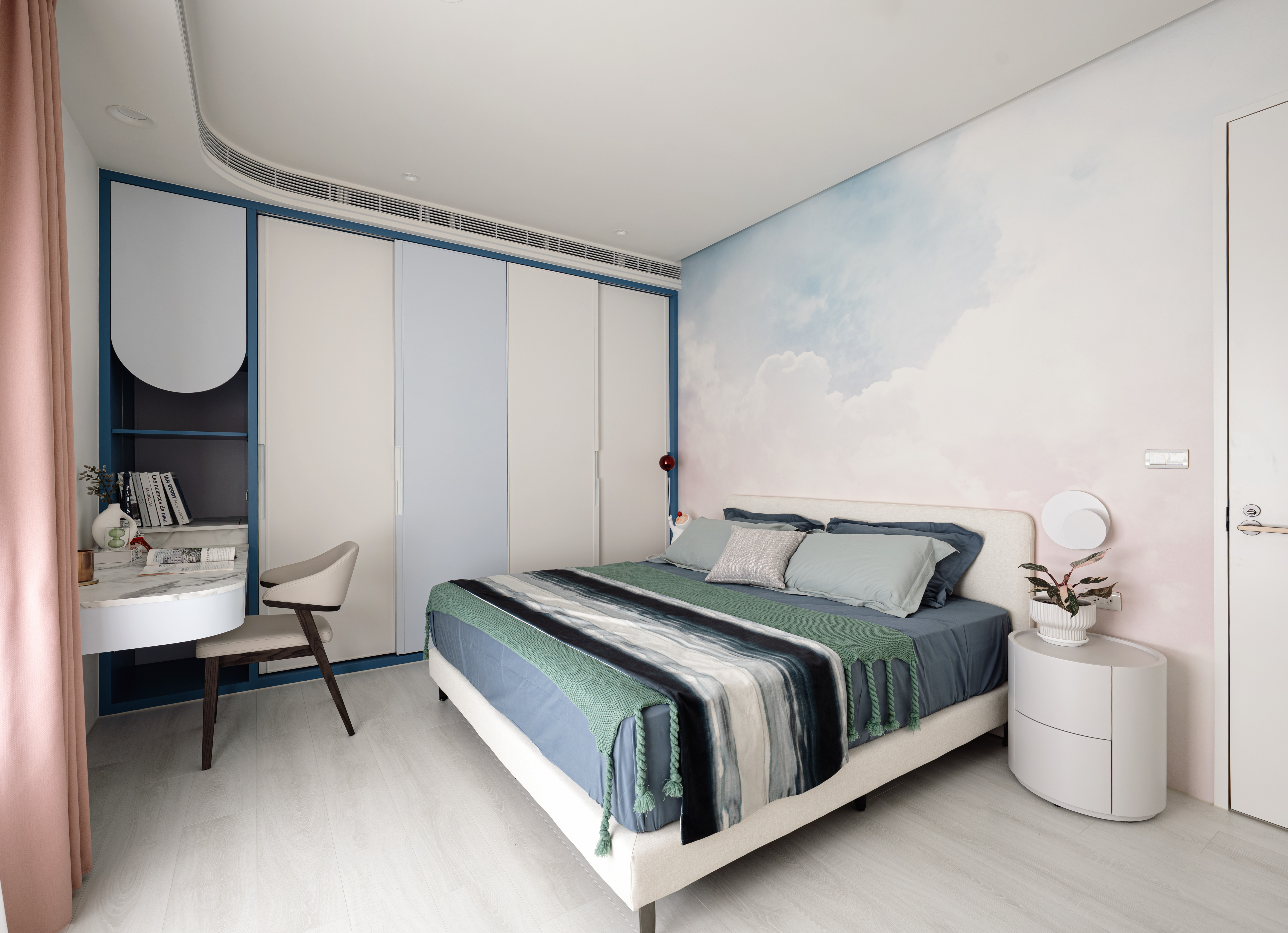 The private area is equally thoughtful. Wallpapers in the children’s rooms were personally chosen by the homeowners’ two elementary-school daughters, one themed around the jungle, the other inspired by the sky and moonlight in soft blue tones. Adjustable circular wall lamps mimic the changing phases of the moon. The master bedroom features a fabric-wrapped headboard and soft curves to create a sense of calm enclosure, while a hidden study provides a simple, private retreat for the homeowner.