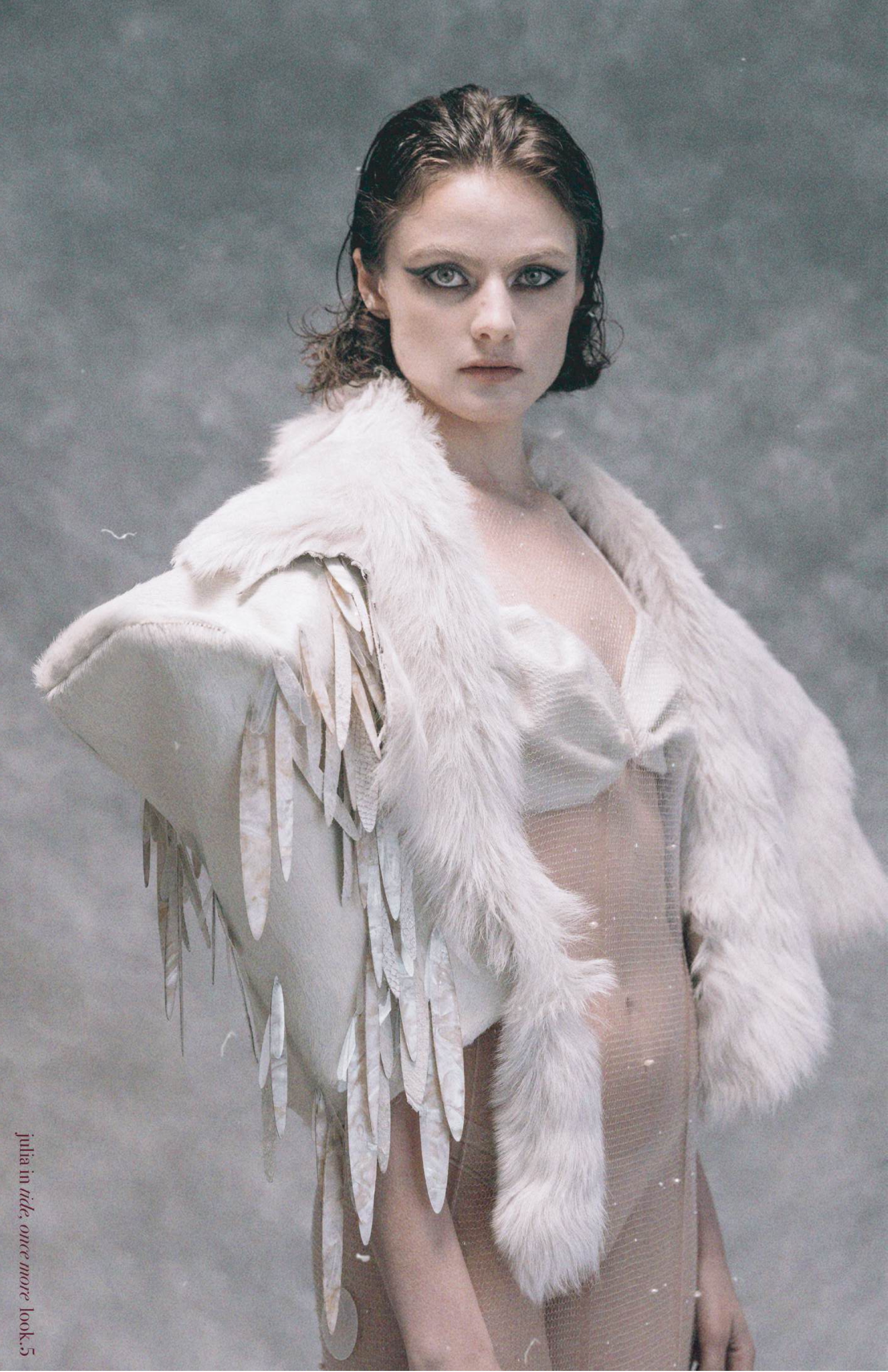 Tide is a fashion collection that explores the cyclical nature of identity, transformation, and the fluid boundary between land and sea. Rooted in a recurring dream in which the designer becomes a dying whale dissolving into the ocean, the collection examines decay not as an ending but as a passage toward rebirth. This dreamlike metamorphosis informs both the concept and the material language of the work, guiding a return to primordial origins and an imagined evolution in reverse. Drawing from the skeletal structures of marine organisms, the silhouettes reference shells, mollusks, and deep-sea anatomy. Spiral pattern cutting mirrors natural growth patterns, creating garments that wrap, coil, and unfurl around the body. The tension between restriction and fluidity becomes a key narrative element: limited arm and leg mobility evokes the shift from land-dwelling creature to aquatic being, while loose, draped layers echo the process of molting and shedding outdated forms. Material experimentation lies at the core of the collection. Mother-of-pearl, sourced from furniture and chandelier industries, are cut and re-engineered into delicate sequins that shimmer like shifting scales. Translucent leathers, produced through specialized bleaching, introduce fragility and lightness, while fish-skin leather adds an organic tactility rooted in sustainable reuse. Laser engraving captures the moment of fabric disintegration, preserving ephemeral textures as permanent surface details. Knitted elements, created with mohair, fishing wires, and natural gemstones, contribute a raw, oceanic softness that contrasts with rigid shell-like structures. Environmental consciousness shapes the project’s material philosophy. Over 80% of leathers are reclaimed from deadstock or industrial scraps, reframing waste as a source of beauty and emphasizing fashion’s potential for transformation beyond aesthetics. Ultimately, TIDE is a narrative of becoming—an exploration of how the body, environment, and imagination intersect in states of change. Each garment embodies the shifting boundaries between human and animal, solidity and dissolution, familiarity and the unknown. Through innovative techniques and poetic symbolism, the collection invites viewers to experience transformation as an ongoing process, mirroring the ocean’s perpetual motion and the fluid evolution of identity itself.